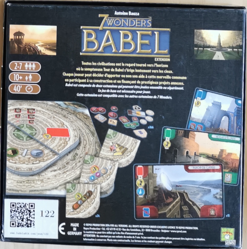 Description : 7 Wonders : Babel comprend deux modules à utiliser avec le jeu de base 7 Wonders, et ils peuvent être utilisés individuellement ou ensemble dans n'importe quelle combinaison avec d'autres extensions.