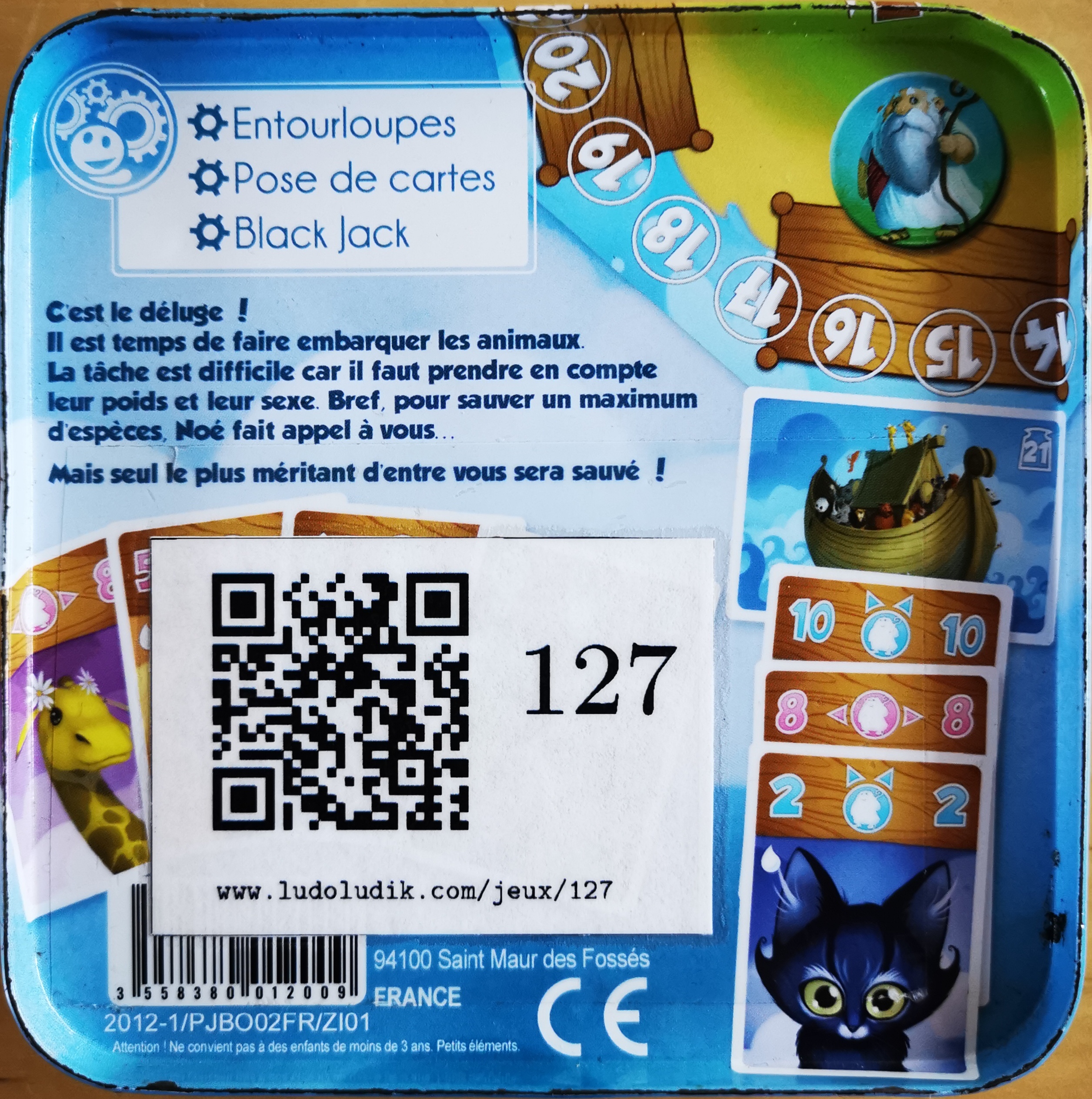 Matériel : 1 règle du jeu, 1 plateau (4 pièces), 1 pion noé, 5 pions score, 60 cartes.
