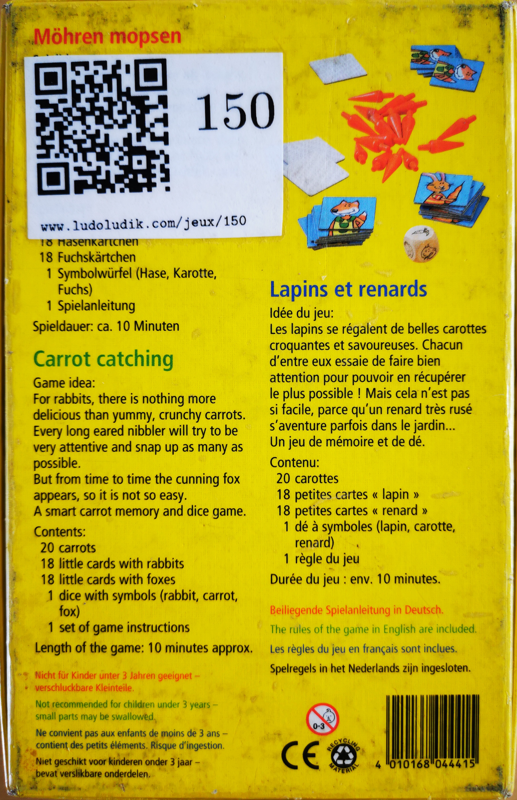 Matériel : 1 règle du jeu, 20 carottes, 36 tuiles (18 de chaque), 1 dé à 3 symboles équiprobables.