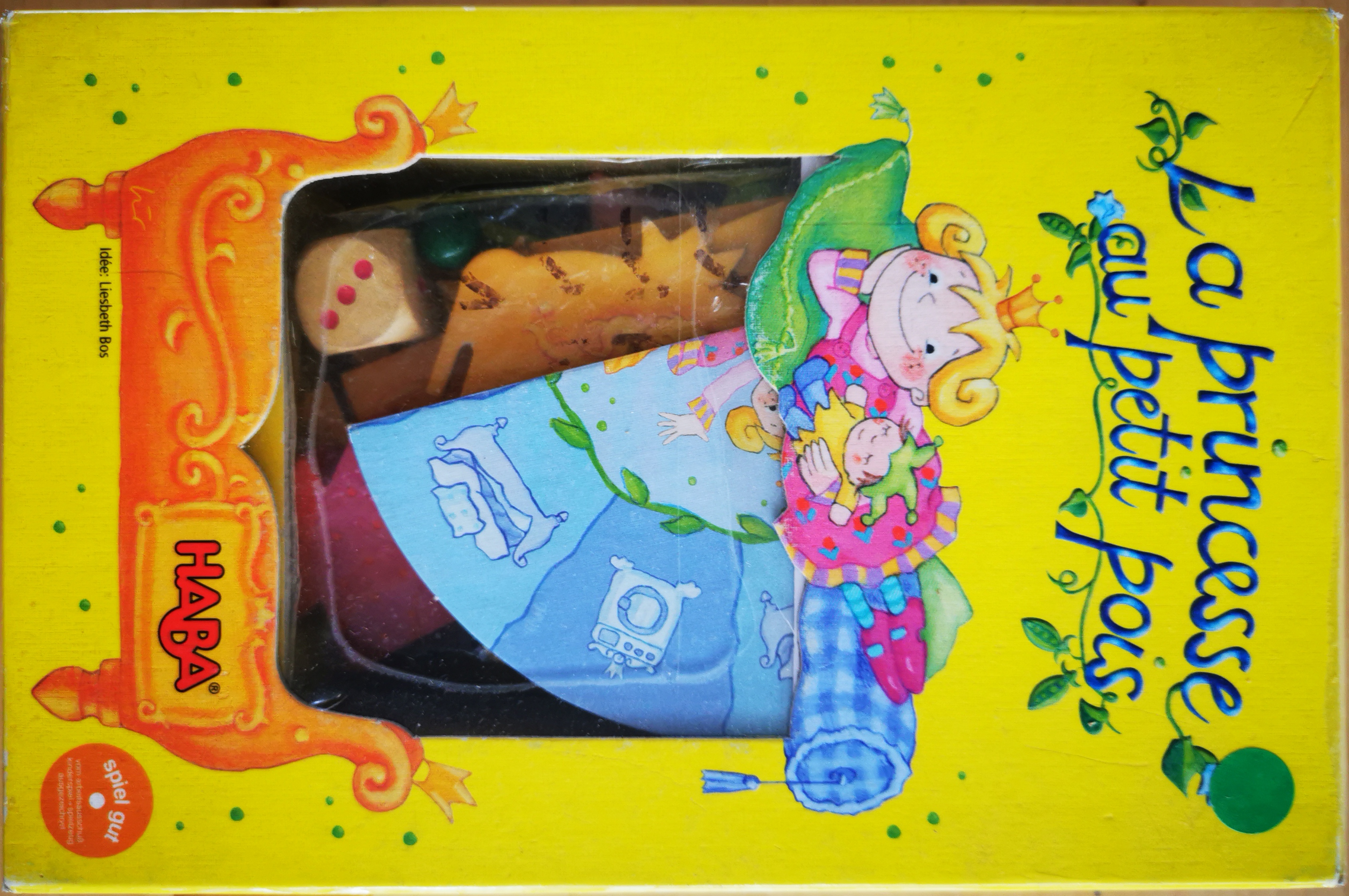 Matériel : 1 règle du jeu, 4 matelas, 8 coussins (4 couvertures, 4 oreillers), 1 plateau, 1 cadre-lit, 1 princesse, 1 petit pois, 1 dé.