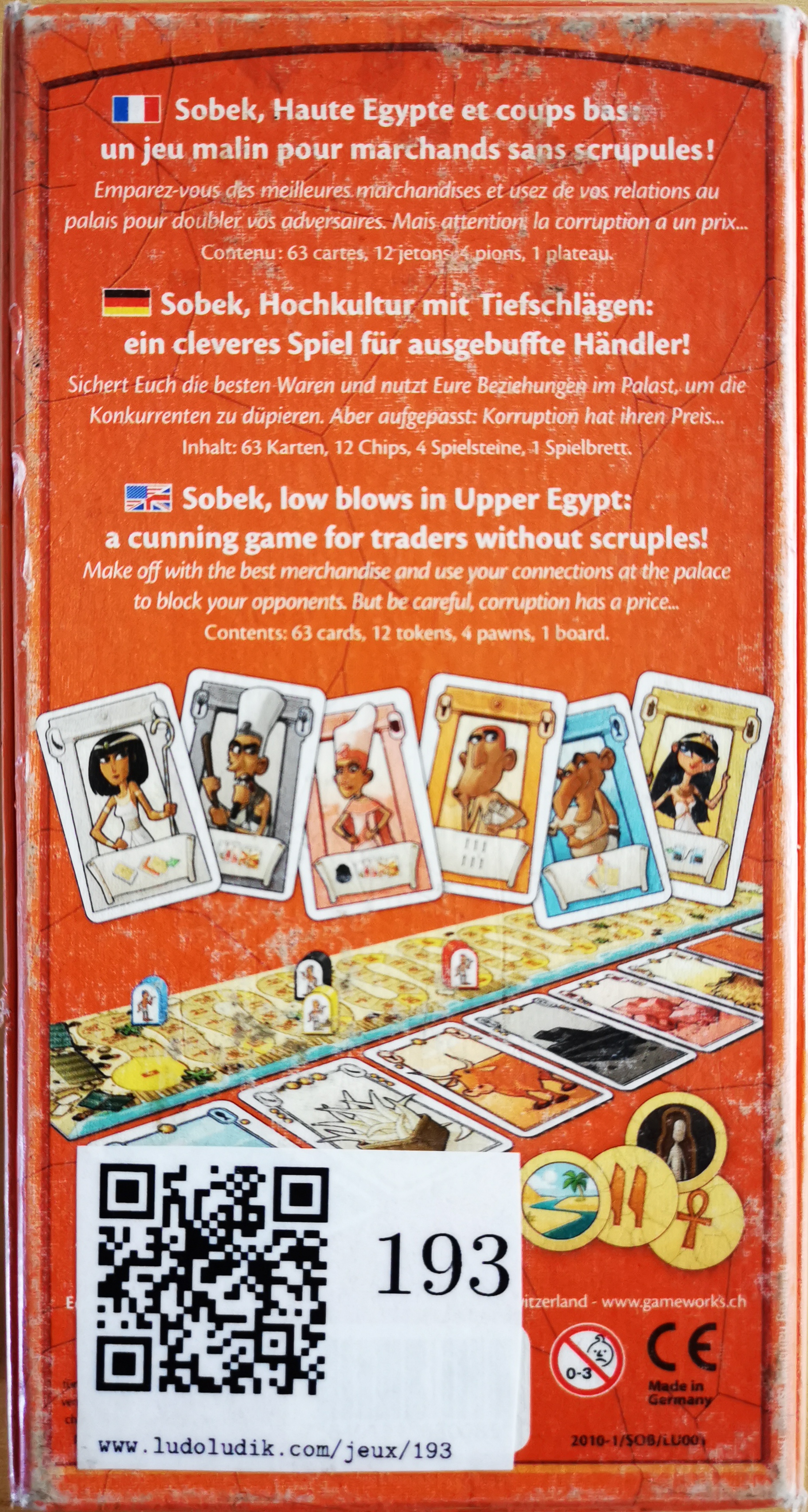 Matériel : 1 règle de jeu, 1 plateau, 4 pions, 12 jetons évènements, 4 plaquettes corruptions, 63 cartes (54 marchandises et 9 personnages).