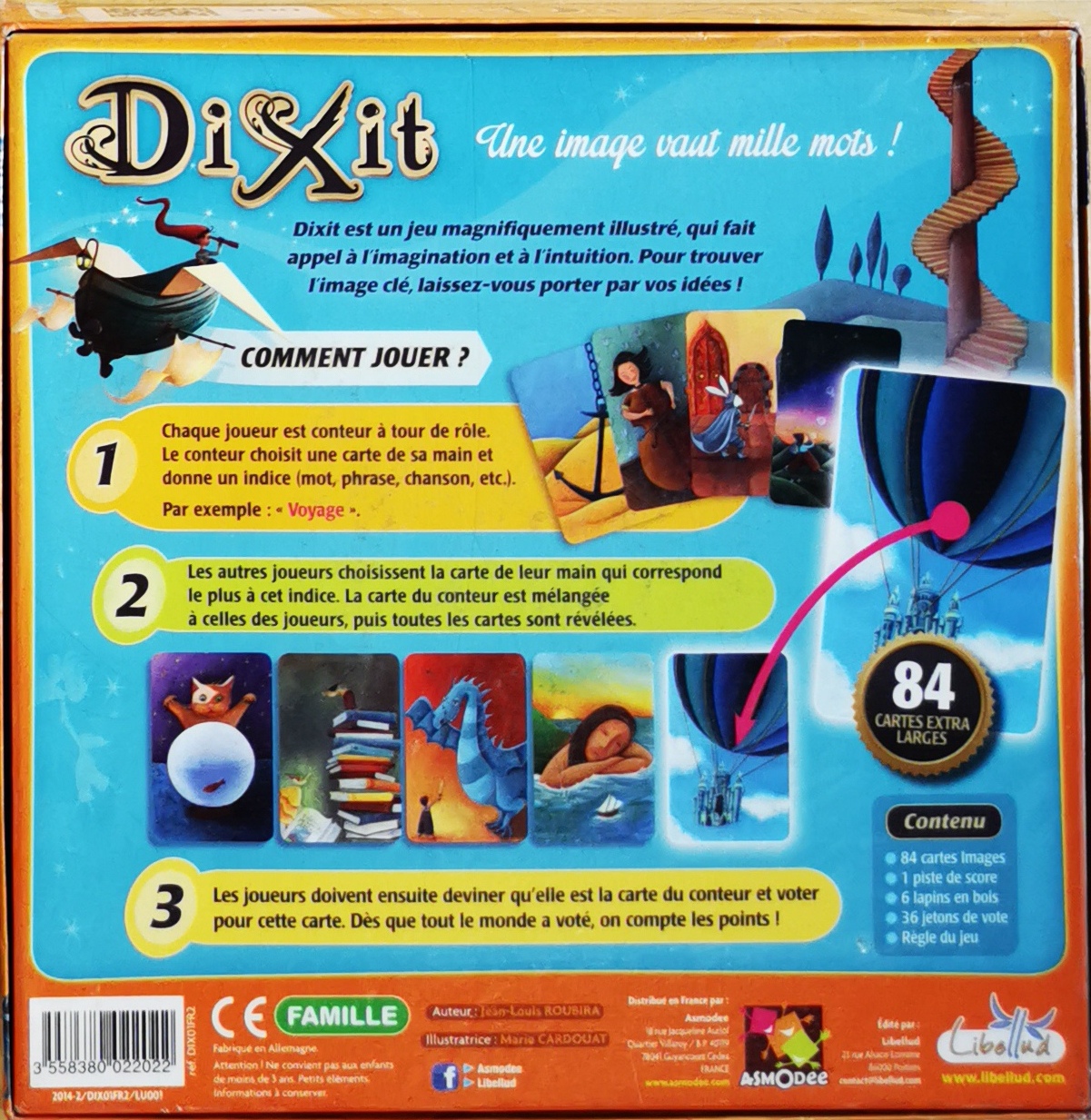 Matériel : 1 règle du jeu, 1 plateau inséré dans la boite, 84 cartes, 36 cartons "vote", , 6 pions "lapin"