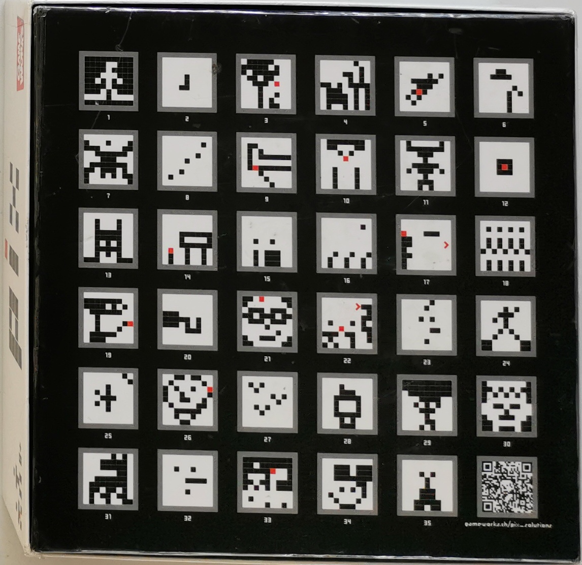 Matériel : 1 règle du jeu, 9 écrans, 230 cartes, 208 pixels noirs, 9 pixels rouges, 9 flèches rouges, 36 cubes, 1 sablier