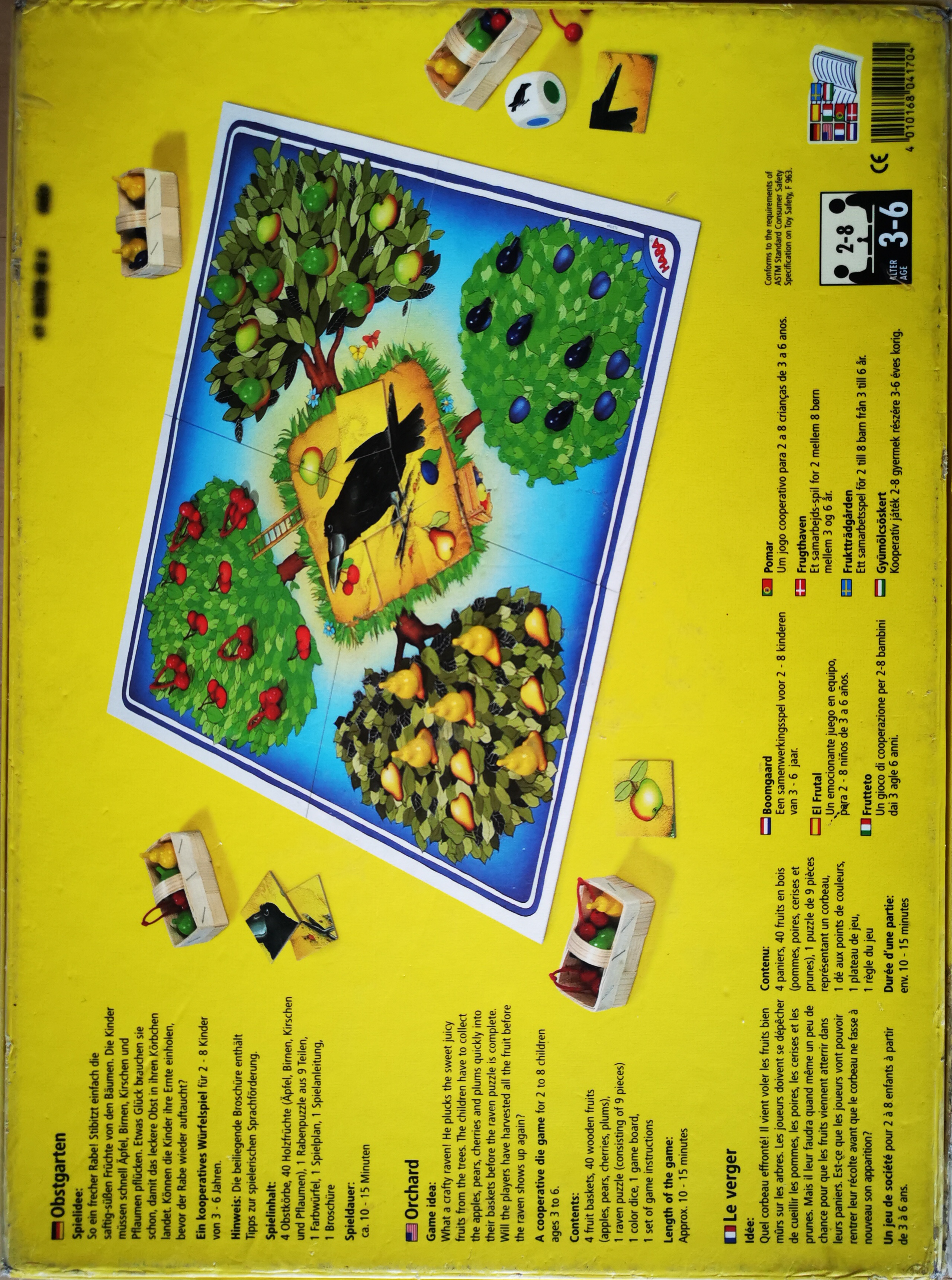 Matériel : 10 pommes, 10 poires, 9 cerises, 10 prunes, 4 paniers (dont cassés), 1 dé spécial, 1 plateau de jeu, 9 pièces de puzzle, 1 règle.