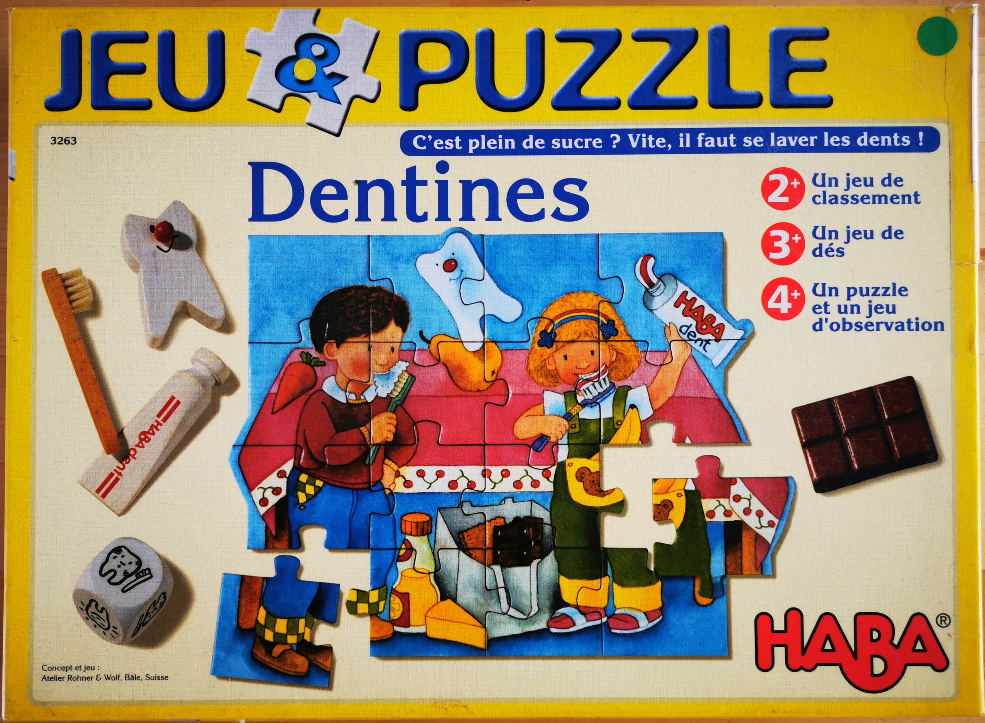 Matériel : 1 règle du jeu, 1 plateau de jeu avec découpes, 1 brosse à dents, 1 dentine, 1 tube dentifrice, 7 aliments, 16 pièces de puzzle, 1 dé, 1 modèle du puzzle, 1 dictionnaire du dentiste.