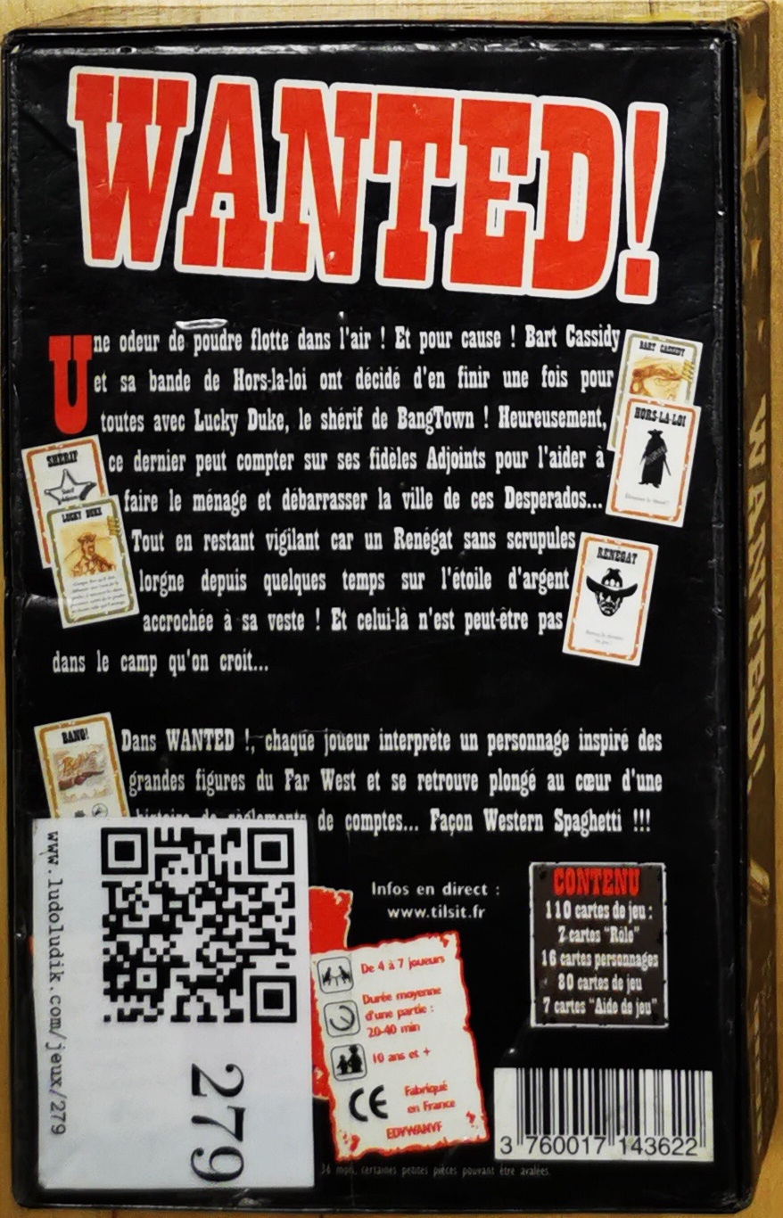 Matériel : 7 cartes rôle (1 shérif, 2 adjoints, 3 hors la loi, 1 renégat), 7 cartes "aide de jeu",, 16 cartes personnages, 80 cartes de jeu.