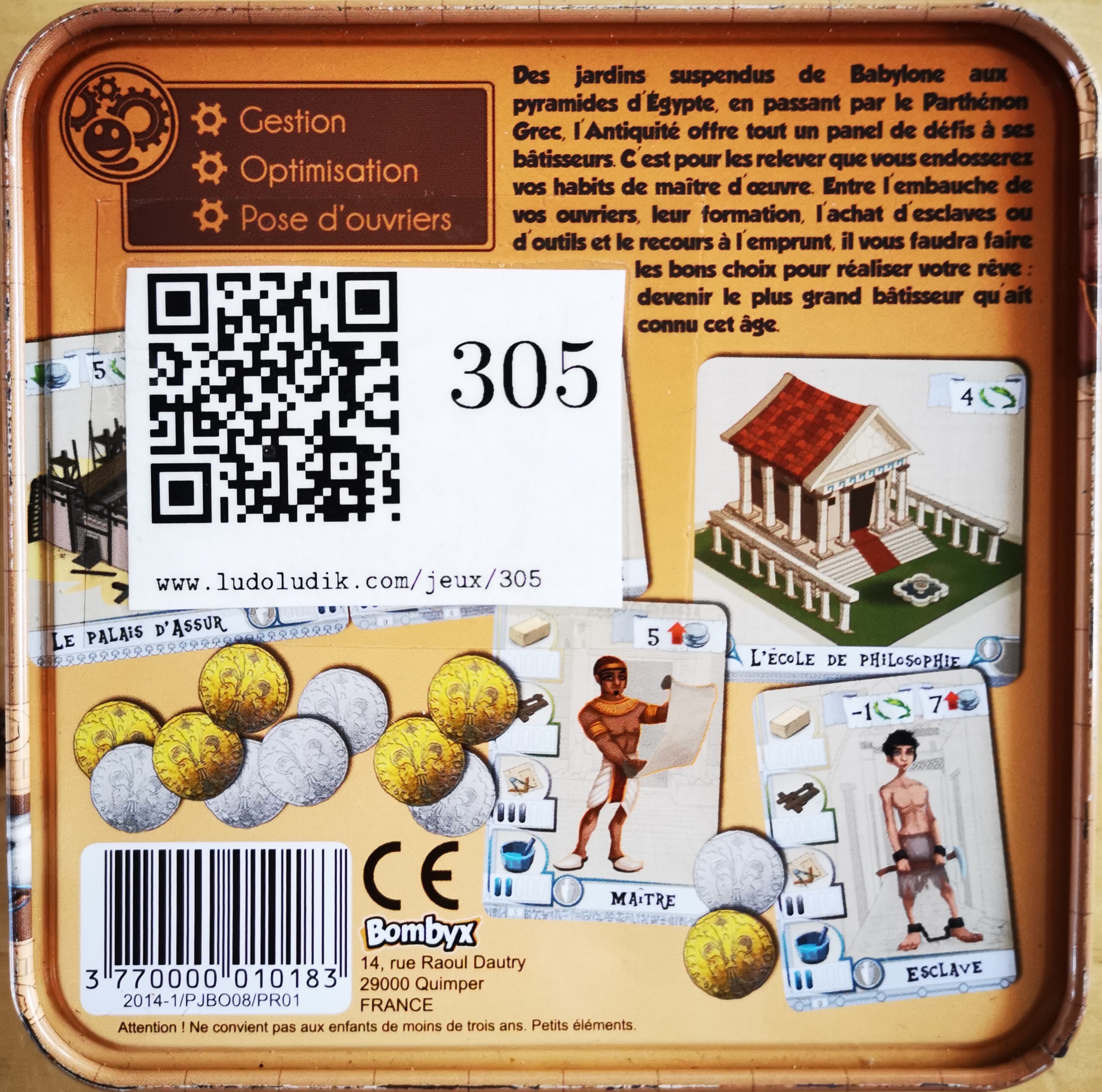 Matériel : 1 règle du jeu, 37 cartes rectangulaires, 33 cartes carrées bâtiment, 41 pièces.
