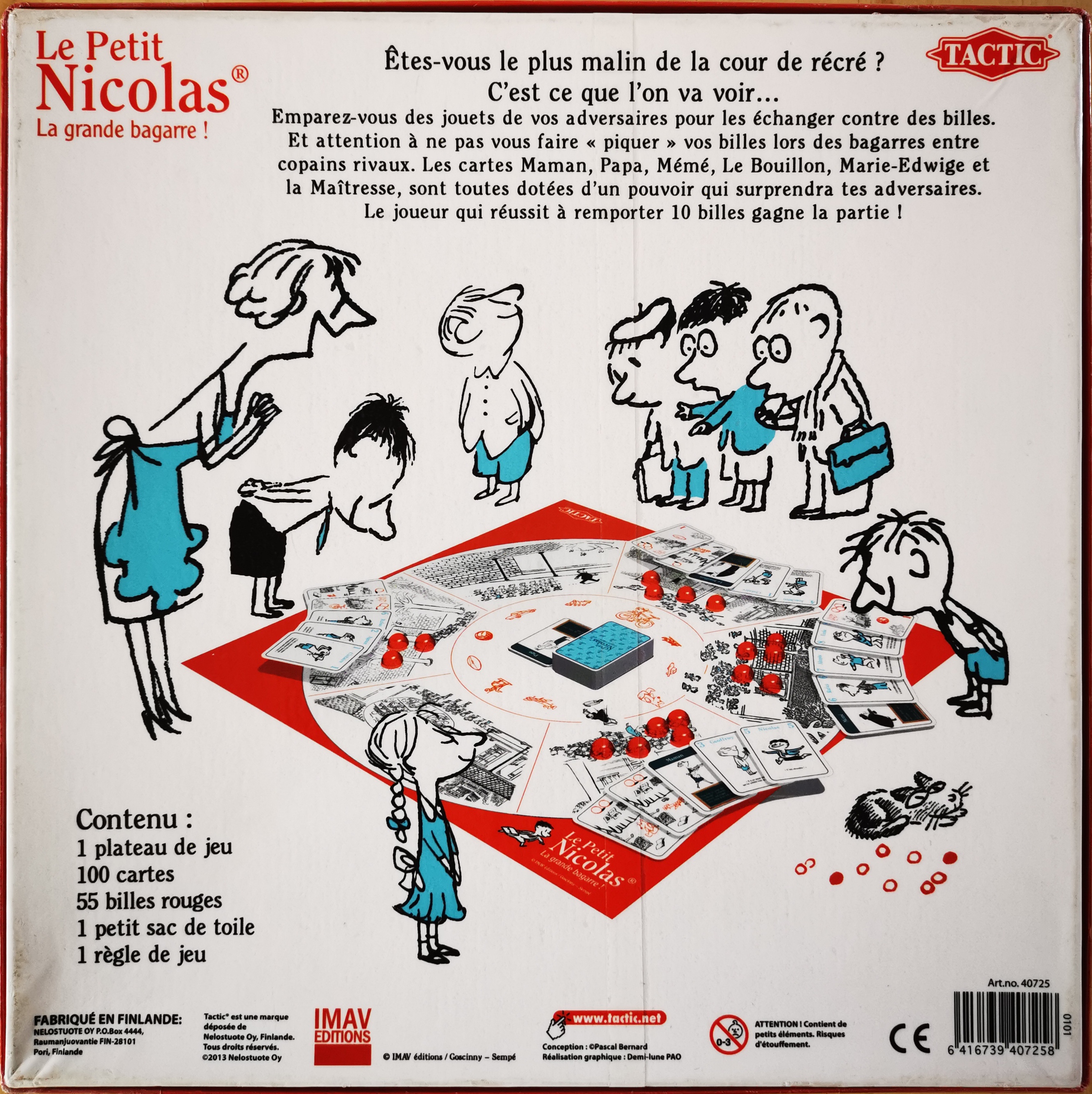 Matériel : 1 règle du jeu, 25 cartes "jouet", 40 cartes "copain", 19 cartes "coup spécial", 6 cartes d'aide de jeu, 10 cartes bonus , 55 billes rouges, 1 petit sac en toile.