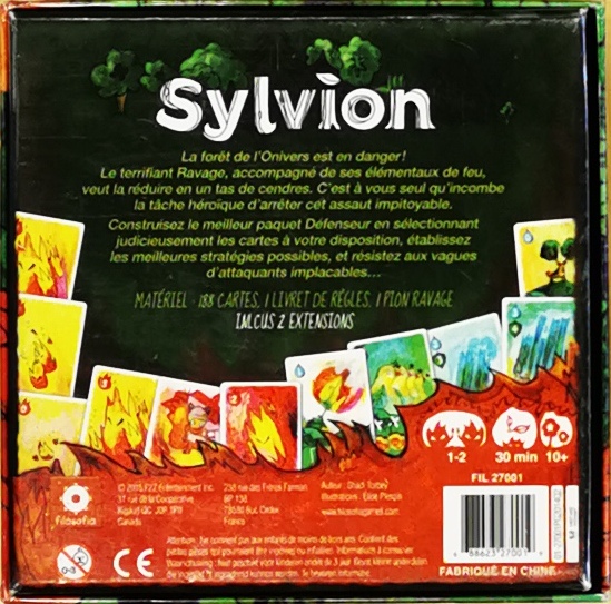 Description : Sylvion est un jeu solo et coopératif pour un ou deux joueurs dans lequel vous devez d’abord empêcher les cartes "ravage" d’infliger trop de dégâts en cours de jeu, car si la vitalité de la forêt tombe en dessus de zéro, vous perdez immédiatement. Ensuite, vous devez vous assurer que lorsque toutes les cartes ravage auront été jouées (c.-à-d. la fin de l’assaut), la vitalité de la forêt sera à son maximum. Pour cela vous devrez jouer habilement vos cartes sylvestres, déjouer les machinations du ravage et contrer ses vagues d’attaques brutales.