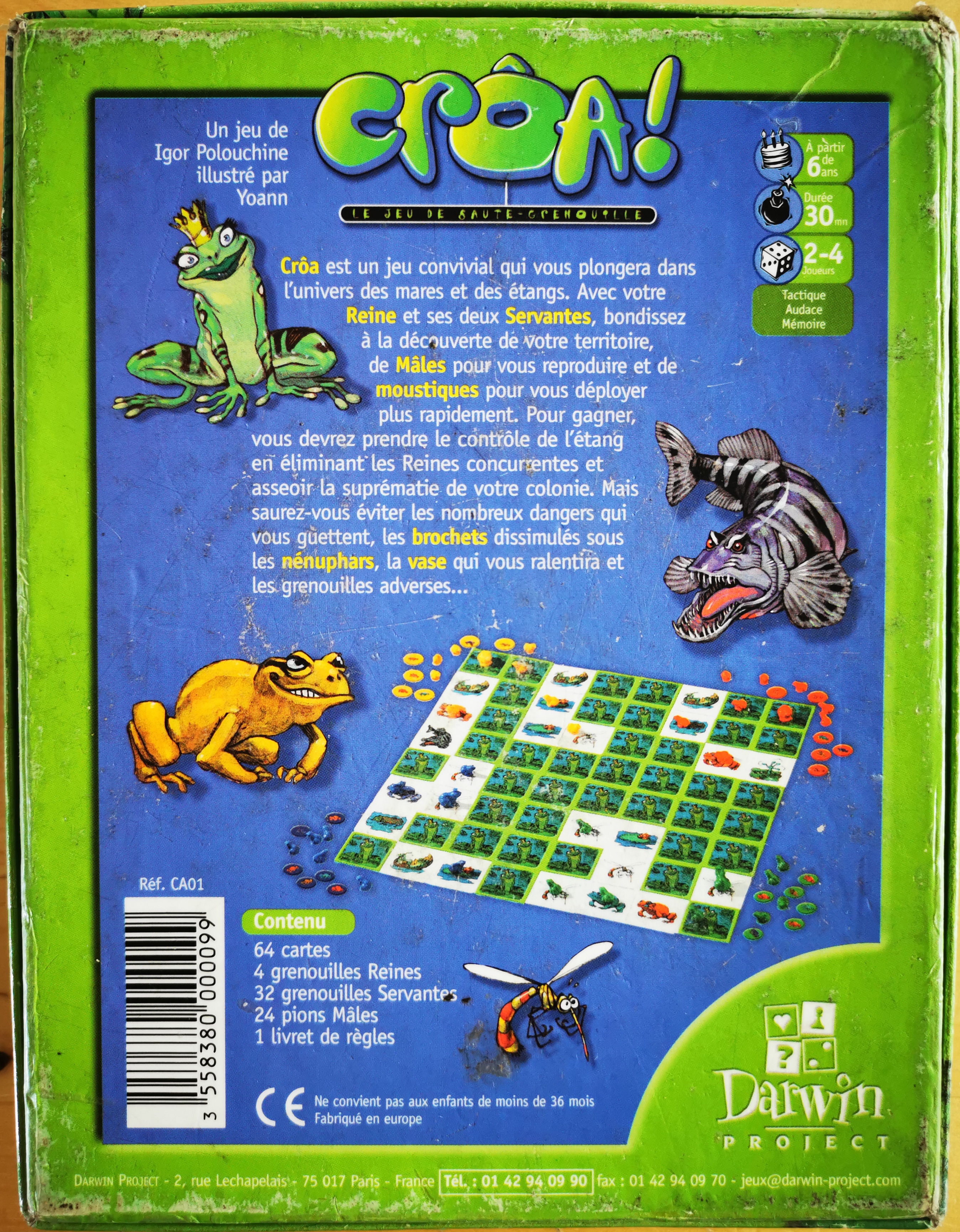 Matériel : 1 règle du jeu, 64 cartes, 4 grenouilles reines, 32 grenouilles, 24 pions mâles.
