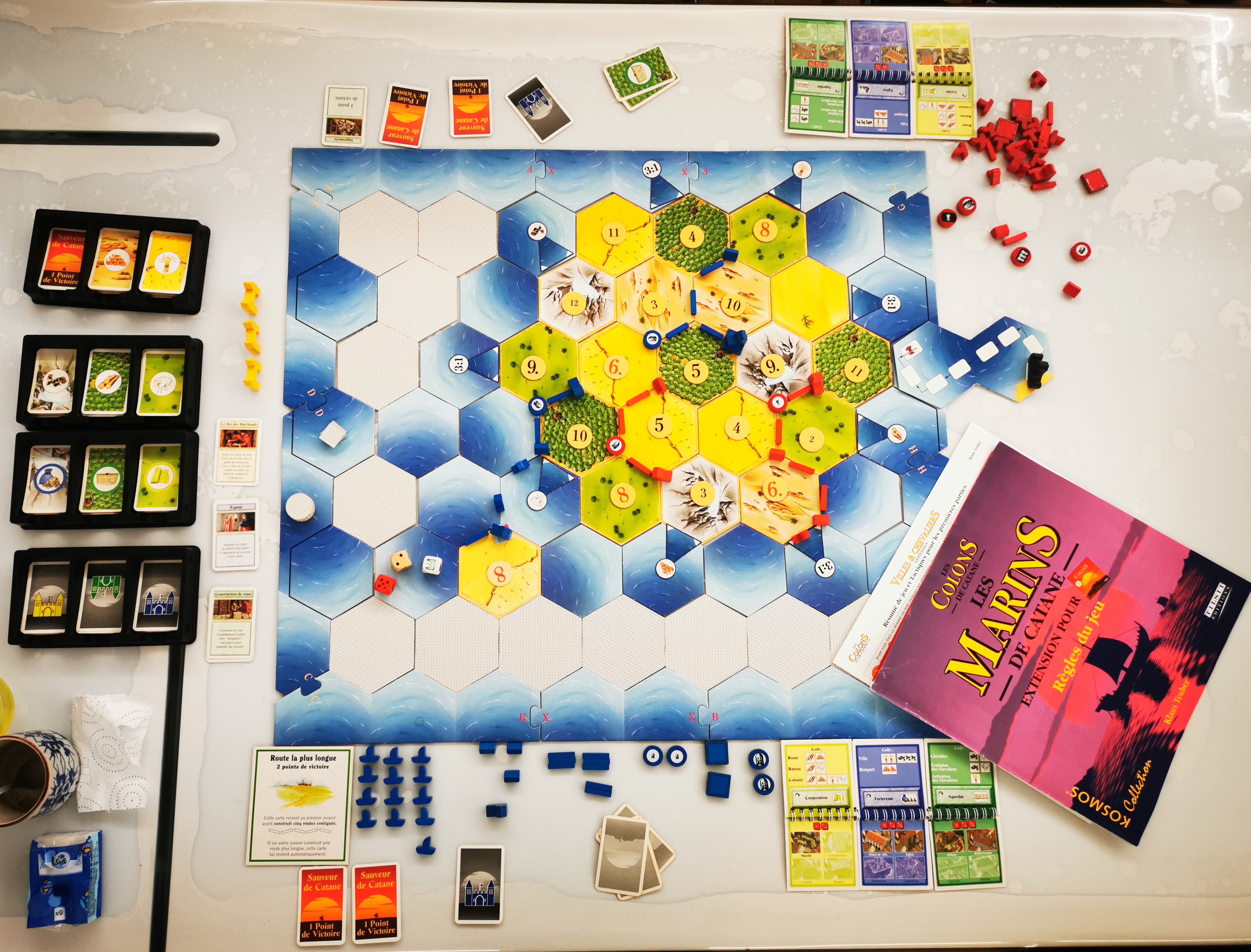 Règle : 1 règle du jeu, 19 tuiles "terrain", 18 tuiles "maritime", 6 fiches cartonnées, 25 cartes "développement", 18 jetons "numérotés", 96 pions de construction rouges, 2 dés, 95 cartes "ressources", 1 pion "voleur"