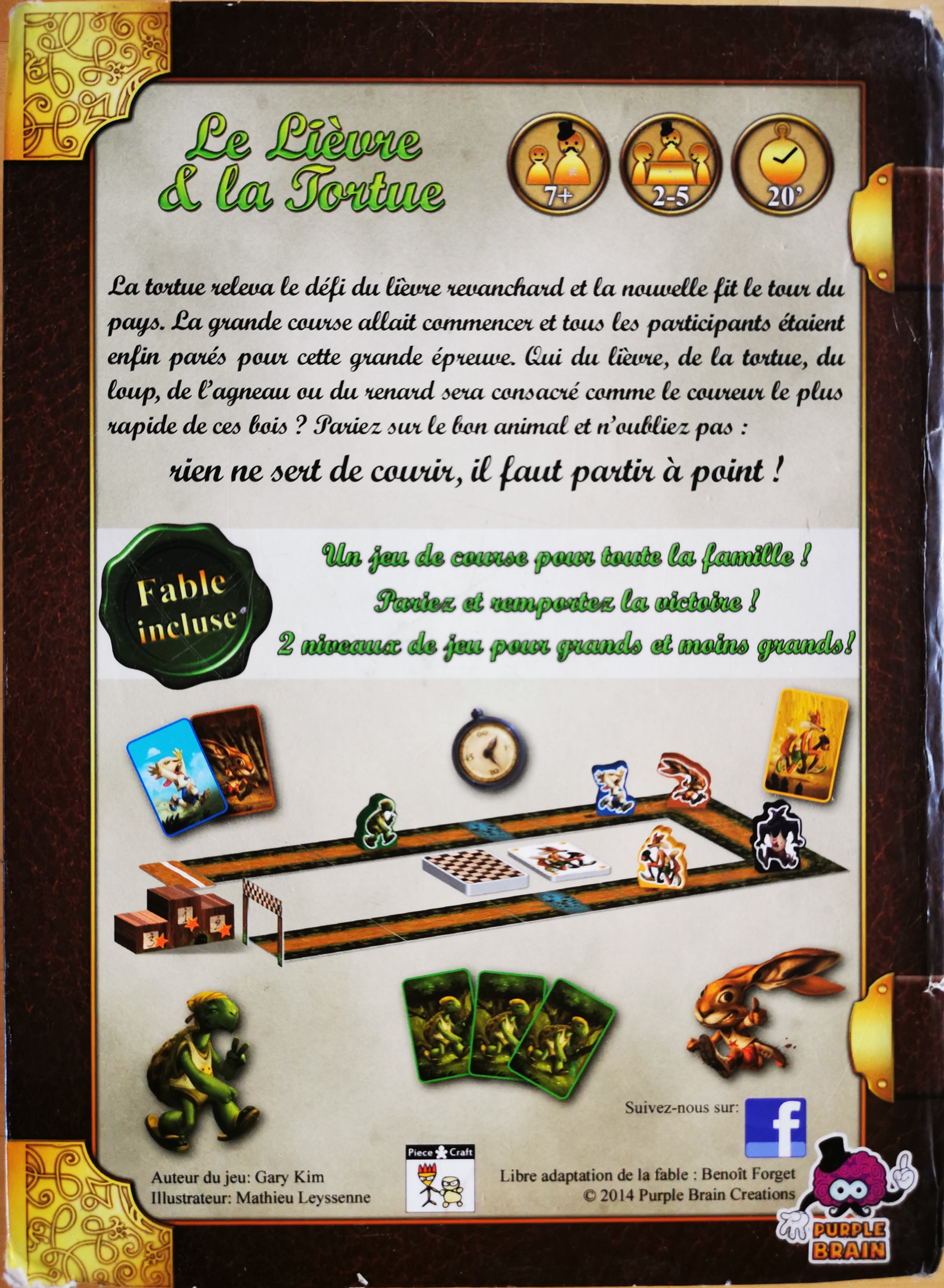 Matériel : 1 règle du jeu, 1 livret de conte, 11 tuiles parcours, 5 pions animaux, 91 cartes, 1 ligne de départ, 1 podium en 5 parties, 1 ligne d'arrivée en 3 parties, 1 jeton premier joueur, 5 jetons turbo.