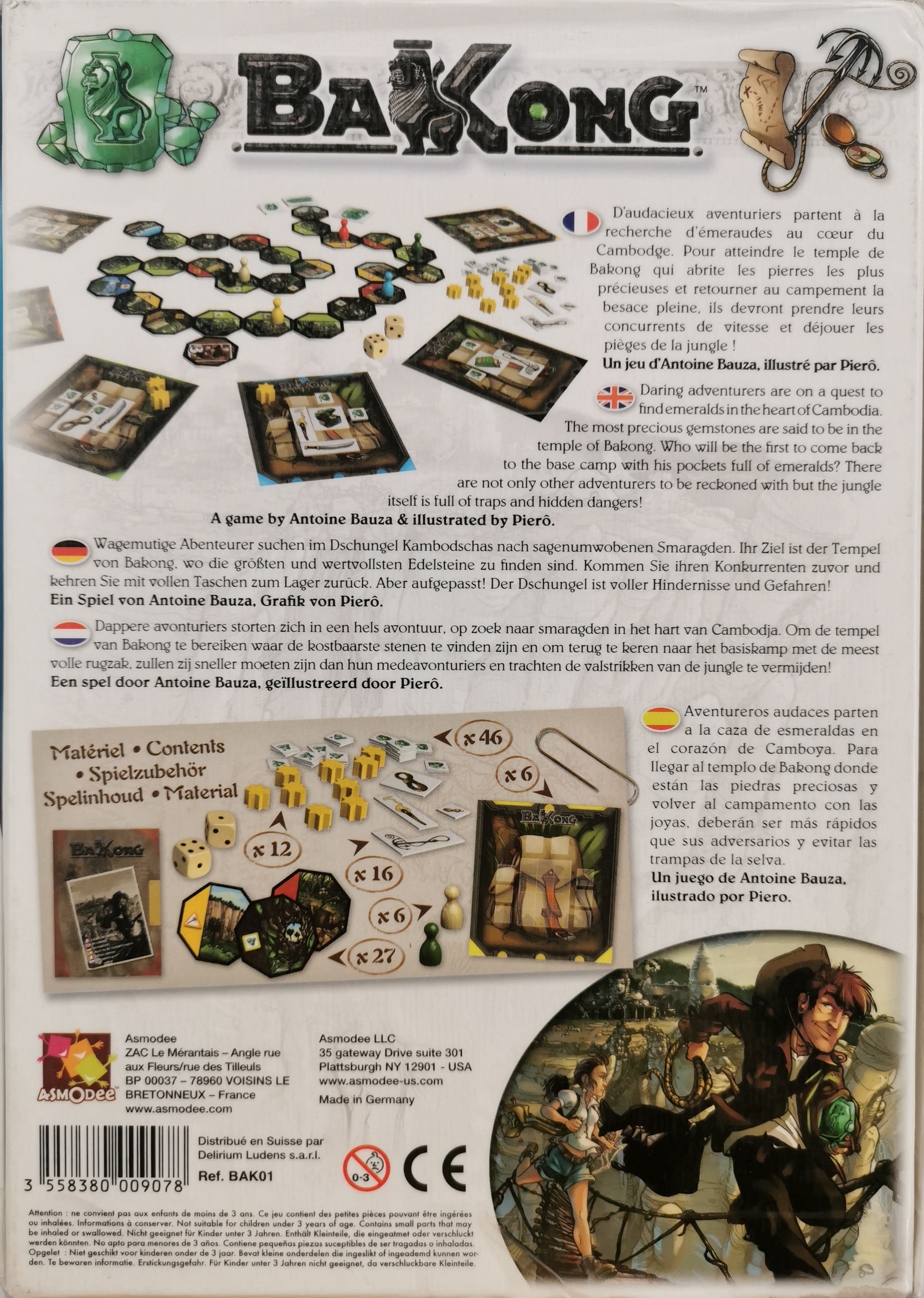 Matériel : 24 tuiles jungle, 1 tuile campement, 1 tuile temple, 6 plateau sac à dos, 6 pions aventuriers, 2 dés,, 6 grosses émeraudes (x1), 19 petites émeraudes (x3), 20 petites émeraudes (x1), 12 pions "outch",, 2 séries de 8 objets, 1 tuile "premier arrivé"