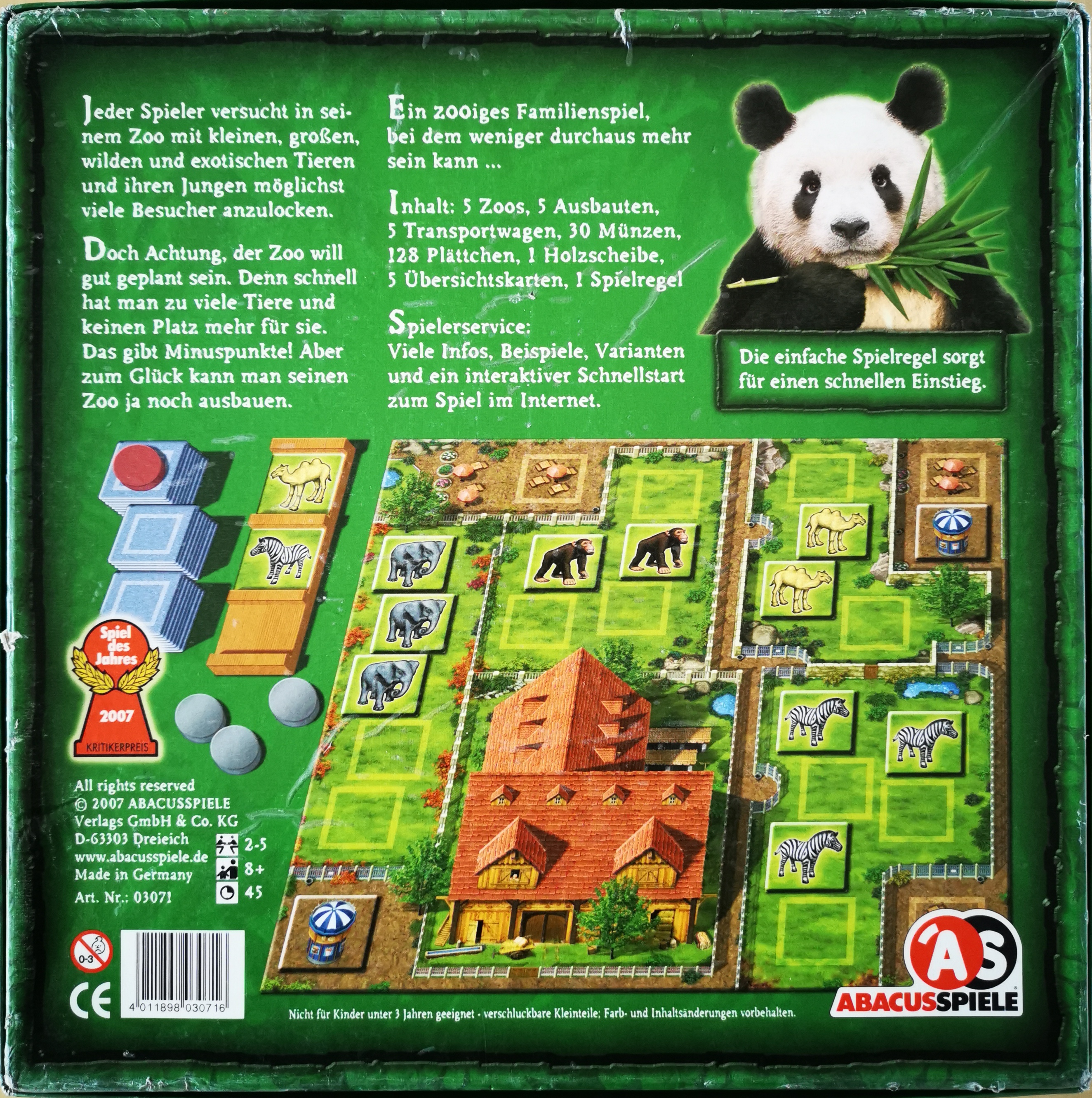 Matériel : 1 règle du jeu, 16 jetons ronds "naissance", 112 jetons carrés ( 88 "animaux", 12 "boutiques", 12 "monnaie"), 5 plateaux "zoo", 5 plateaux "extension de zoo", 5 camions marrons, 30 pièces de monnaie, 1 pion en bois, 5 aides de jeu