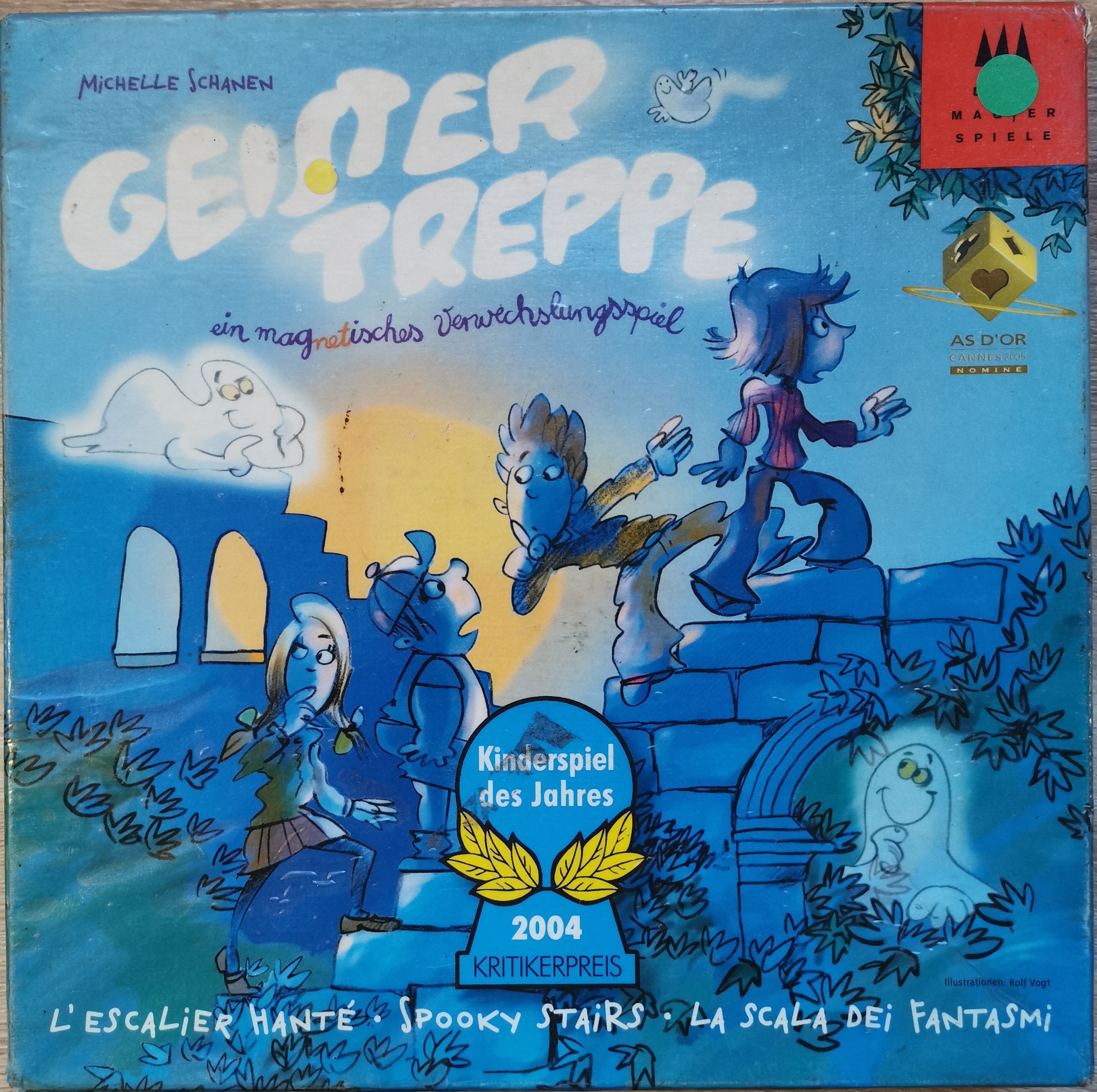 Matériel : 1 règle du jeu, 1 plateau, 4 figurines fantôme, 4 pions enfants en bois, 4 jetons couleurs en bois, 1 dé spécial.