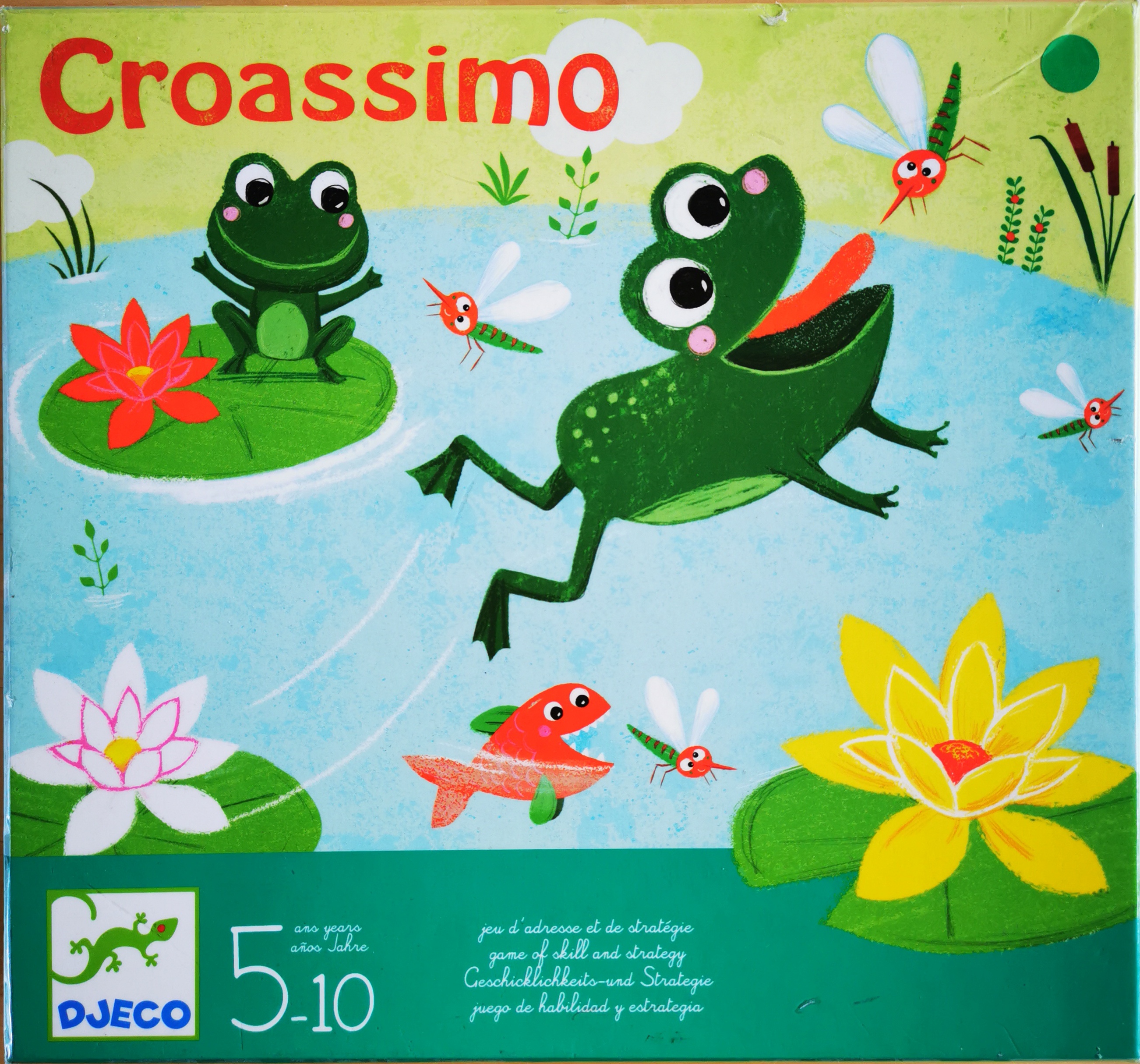 Matériel : 1 règle du jeu, 1 plateau, 4 pions grenouilles, 1 grenouille sauteuse, 48 cartes, 4 tuiles nénuphar.