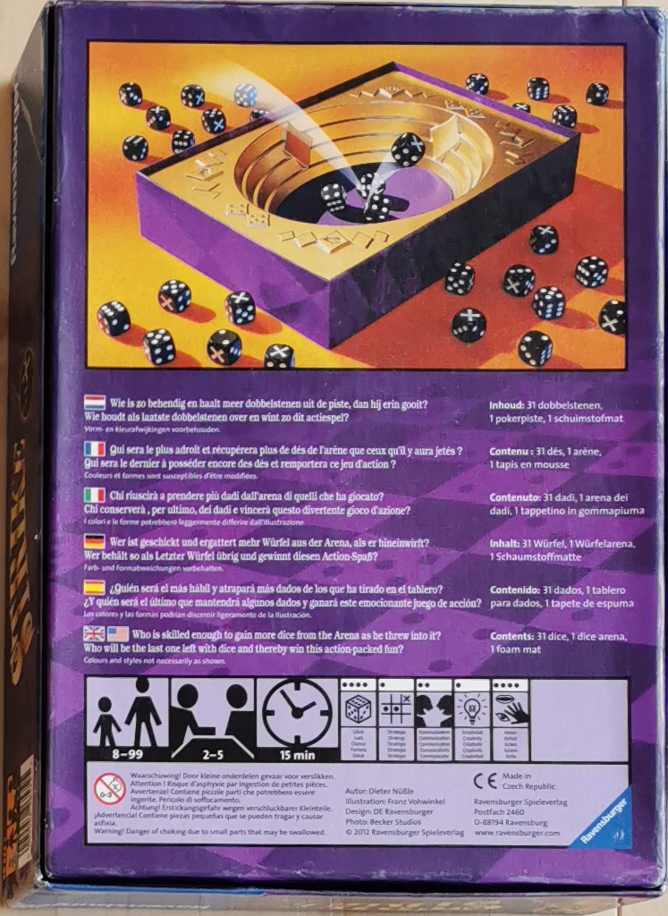 Matériel : 1 règle du jeu, 31 dés, A fond de boite "arène" avec piste en mousse