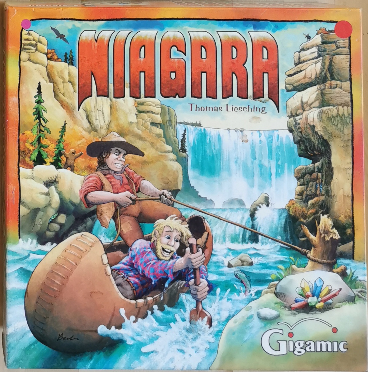 Matériel : 1 règle du jeu, 1 plateau de jeu, 10 canoës, 1 anneau marron, 1 nuage, 40 pierres précieuses, 35 cartes