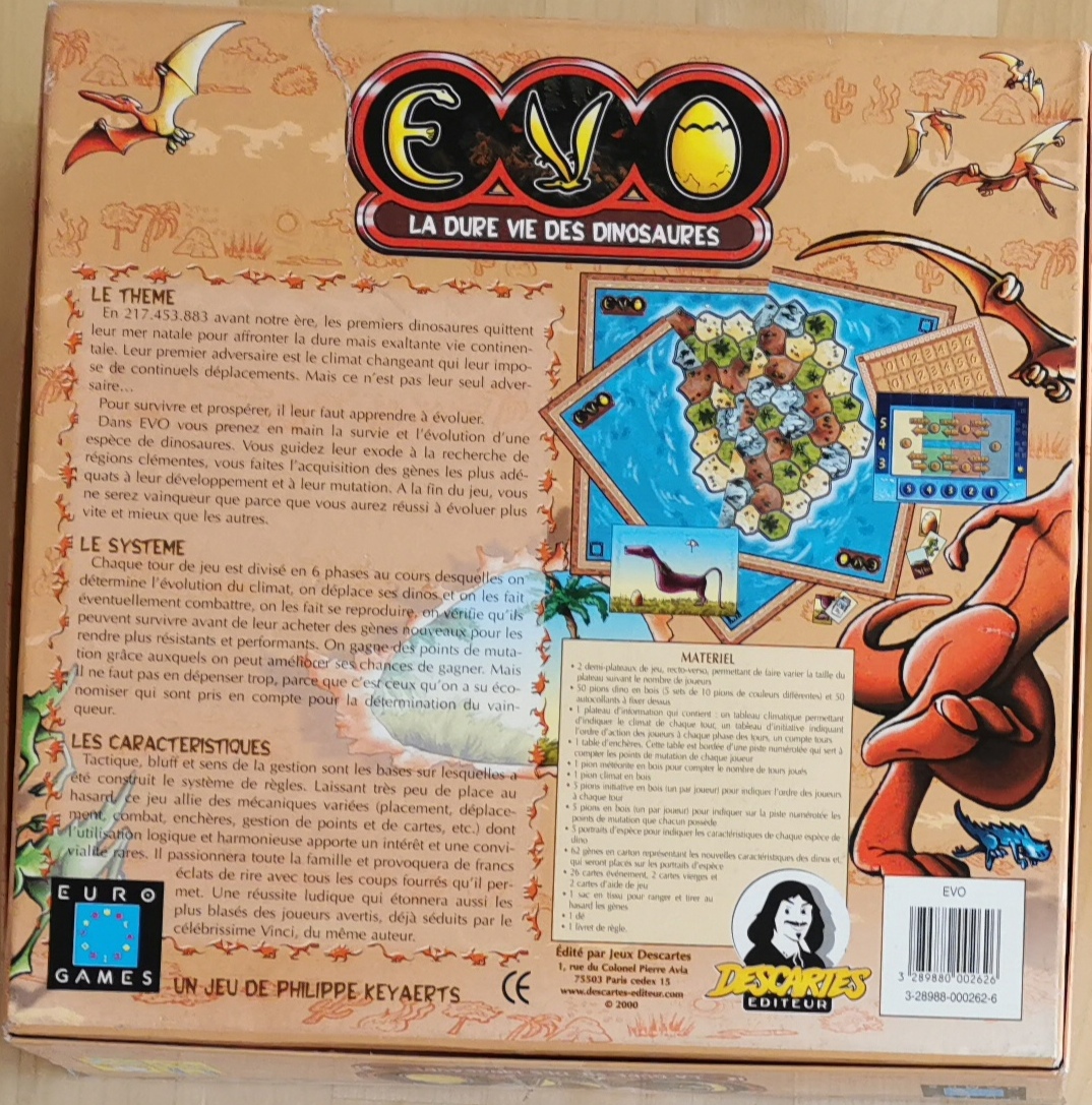 Matériel : 1 règle du jeu, 1 plateau en 2 parties, 1 plateau "score", 1 plateau "information", 5 plateaux "dinosaures", 5 pions, 5 cubes, 1 dé, 1 marqueur noir, 1 pion gris "météorite", 50 pions "dinosaures", 26 cartes "évènements", 2 cartes "résumé", 1 sac en tissu, 62 fiches "gènes"