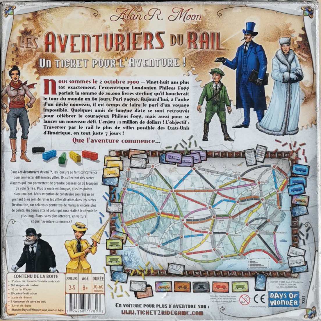Matériel : 1 règle du jeu, 1 plateau, 240 wagons (45 de chaque couleurs), 110 cartes wagons, 29 cartes destinations, 1 carte résumé, 1 carte chemin le plus long, 5 marqueurs de score en bois