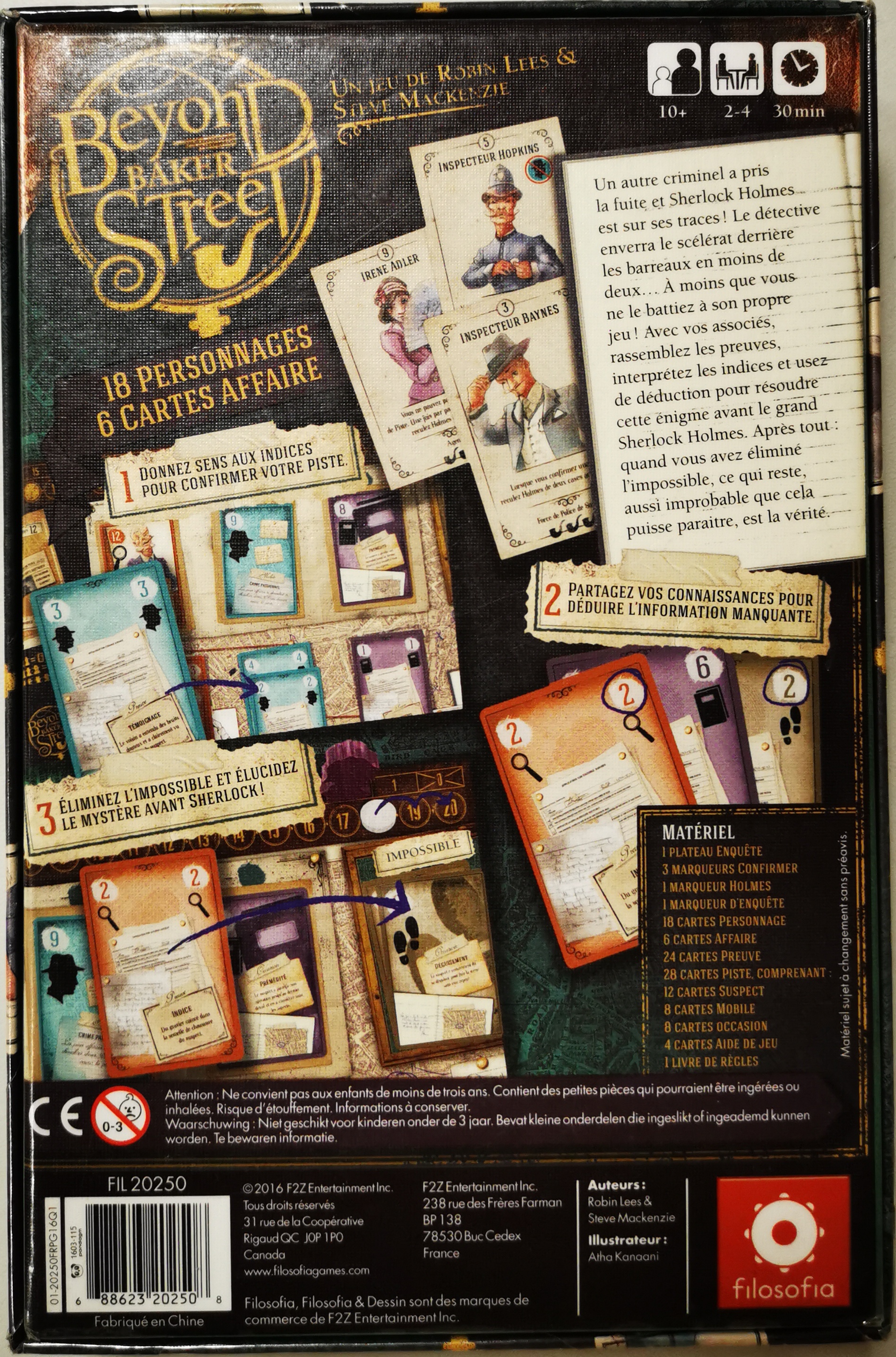 Matériel : 1 règle du jeu, 1 plateau, 4 cartes aide de jeu, 24 cartes preuves, 18 cartes personnages, 6 cartes affaires, 28 cartes pistes avec : 12 cartes suspect, 8 carte mobile, 8 carte occasion, 1 pion blanc enquête, 3 pions bleus marqueurs confirmés, 1 pion Sherlock Holmes.