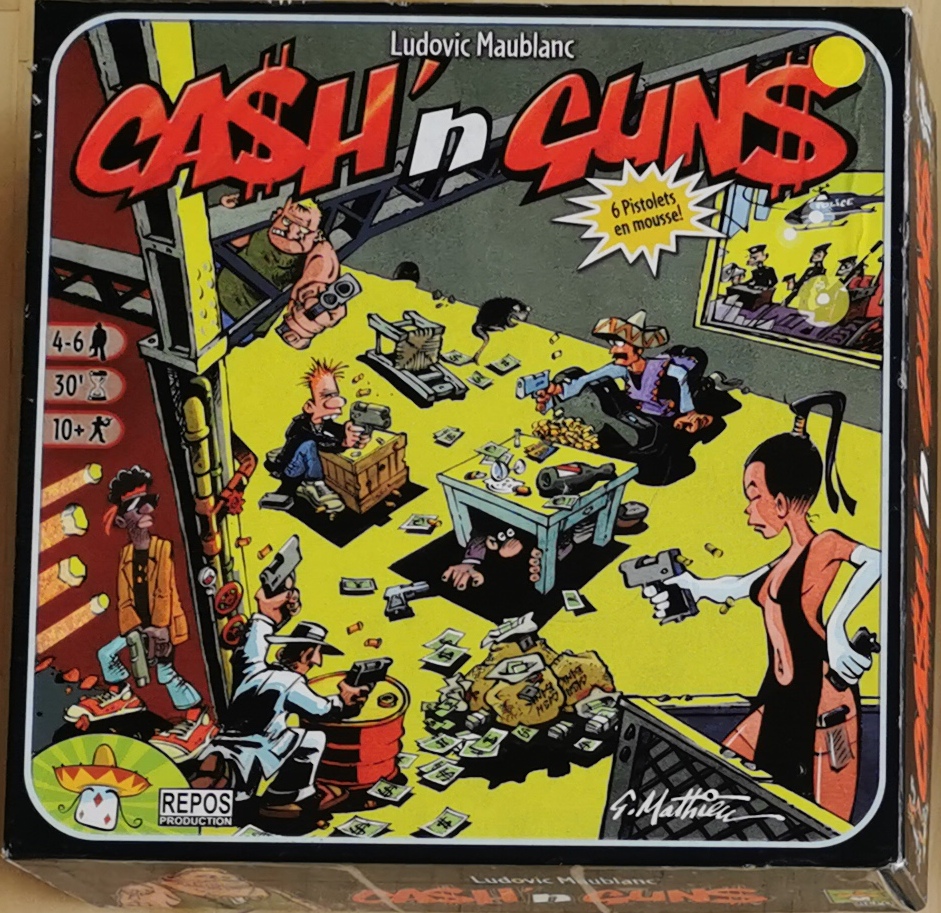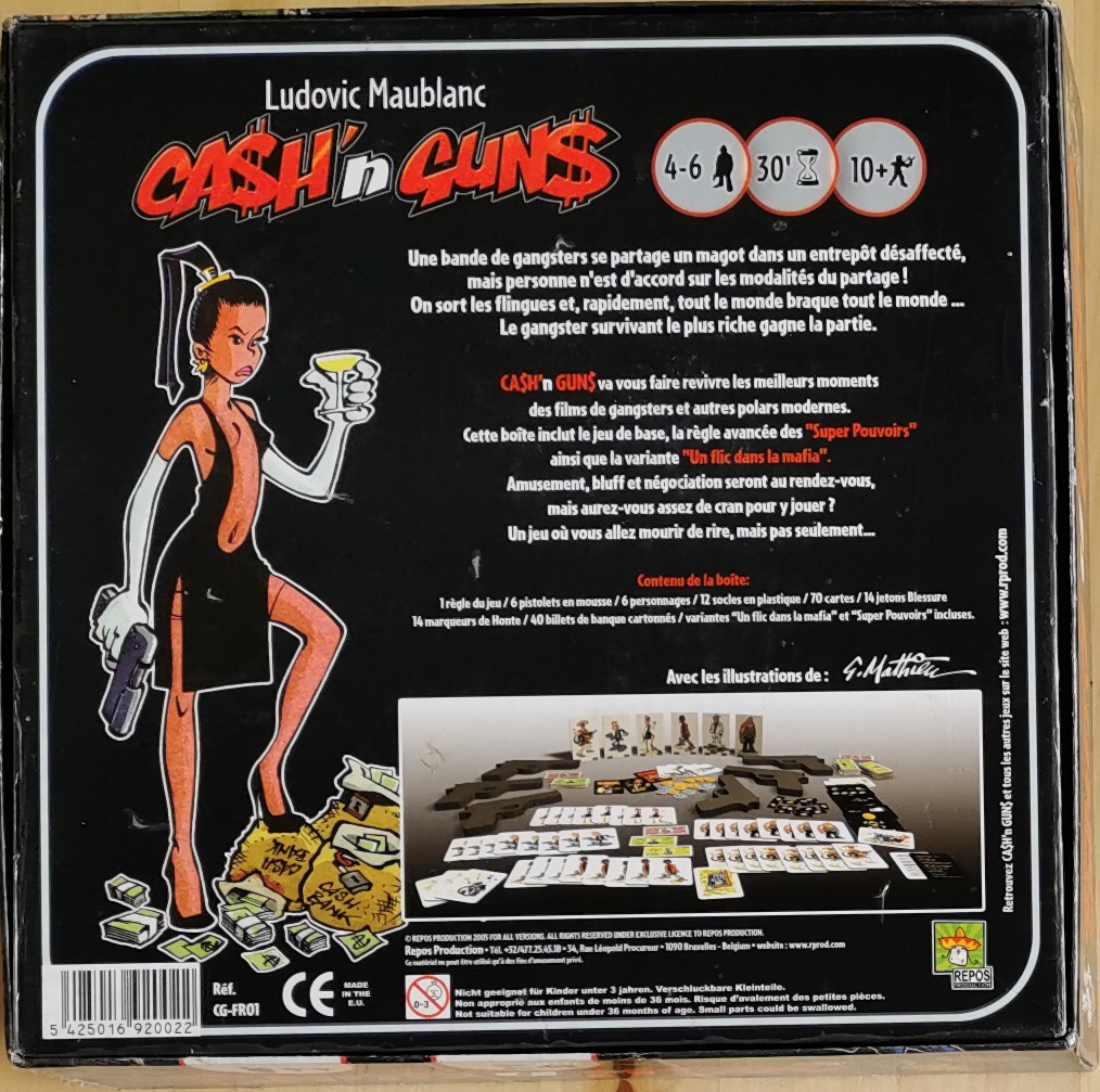 Matériel : 1 règle du jeu, JEU DE BASE:, 6 pistolets, 48 cartes personnages, 1 carte résumé, 14 jetons blessure, 14 jetons honte, 40 billets, 6 personnages + 6 socles, RÈGLES AVANCÉES : 10 cartes super pouvoir, VARIANTE : 3 cartes standard, 6 cartes rôle secret, 1 carte téléphone.