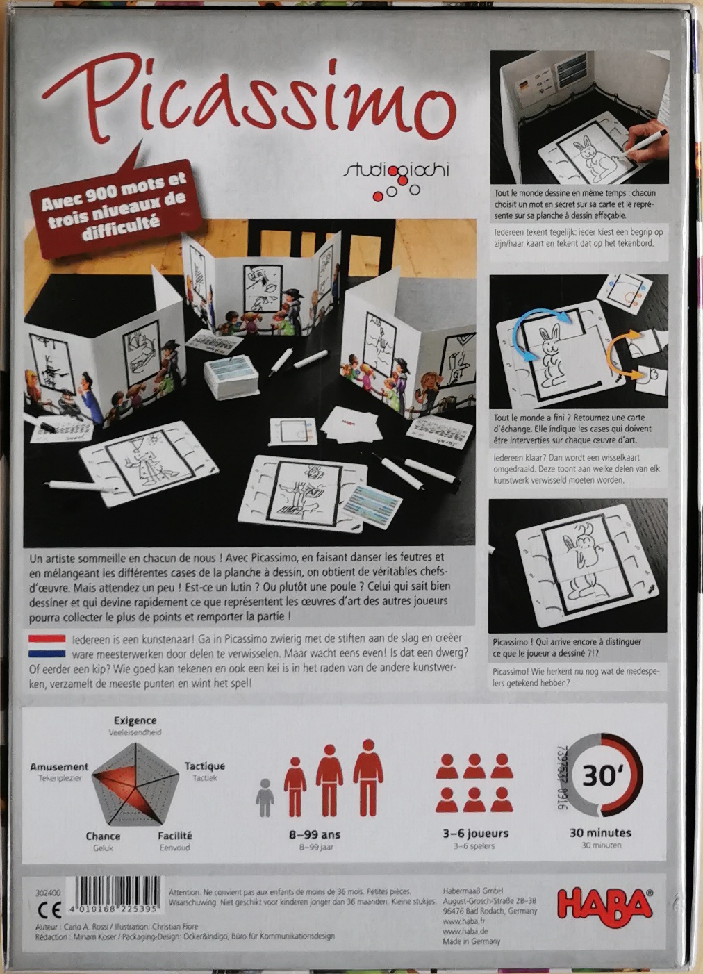 Description : Un artiste sommeille en chacun de nous ! Avec Picassimo, en faisant danser les feutres et en mélangeant les différentes cases de la planche à dessin, on obtient de véritables chefs-d'œuvre. Mais attendez un peu ! Est-ce un lutin ? Ou plutôt une poule ? Savoir bien dessiner et avoir l'œil pour deviner ce que représentent les œuvres d'art des autres joueurs, vous permettra de collecter le plus de points et remporter la partie !