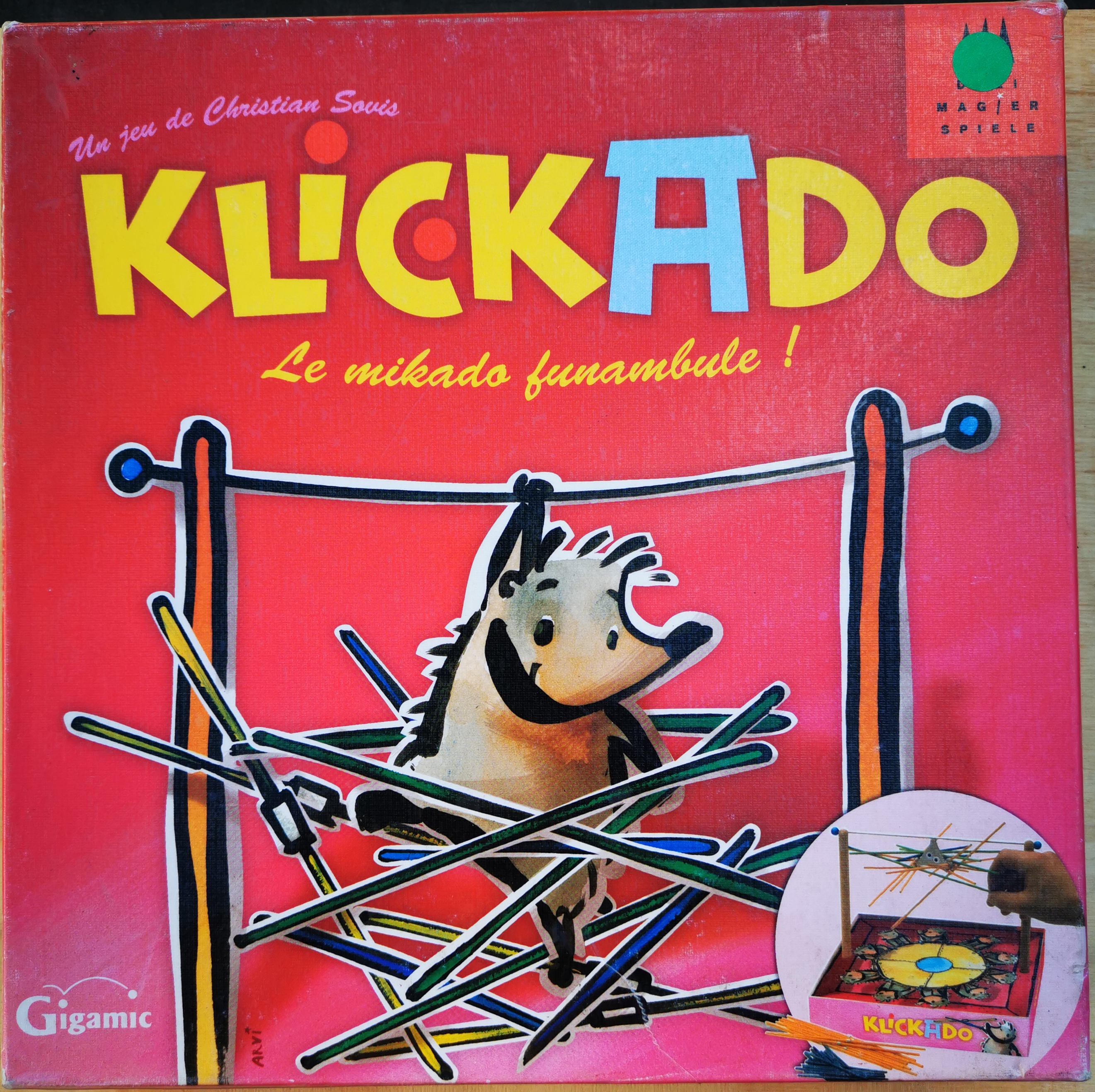 Matériel : 12 grands bâtonnets munis d’un anneau métallique , 20 grands bâtonnets sans anneau métallique , 20 petits bâtonnets , 2 supports , 1 baguette métallique , 1 hérisson , 1 cache en carton , règle du jeu.