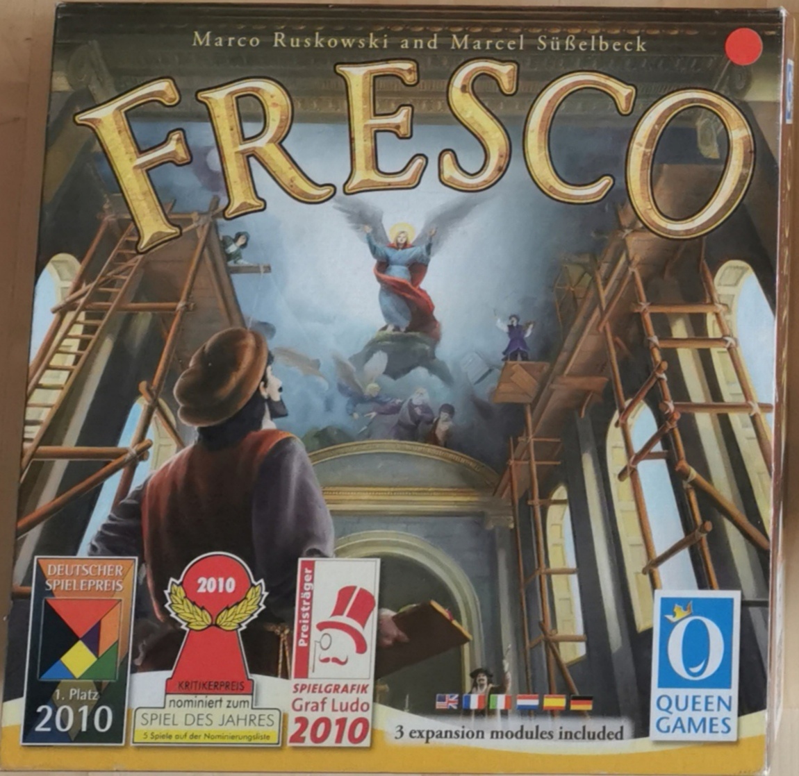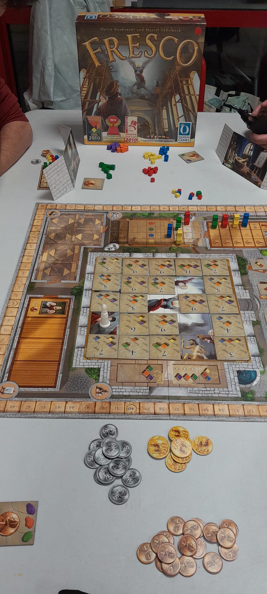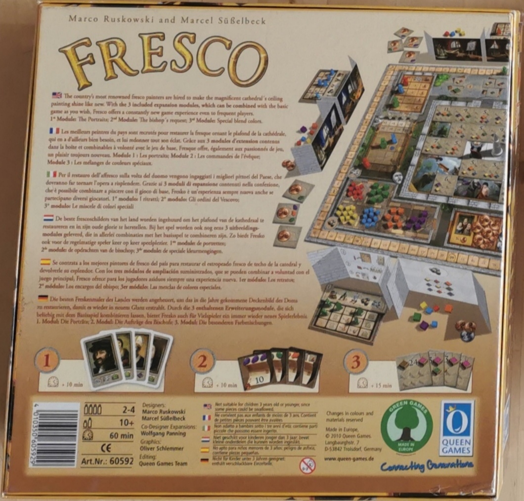 Matériel : • 1 plateau de jeu double face, • 14 tuiles « Marché », • 25 tuiles « Fresque » avec, les valeurs 3 à 11, • 4 assistants de couleur naturelle, • 20 assistants : 5 de 4 couleurs, • 12 peintres : 3 de 4 couleurs, • 1 évêque, • 4 petits paravents, • 4 grands paravents, • 4 tableaux d’action, • 4 cartes avec tableaux de mélange, • 1 sac en tissu 1 règle du jeu, , • 60 pièces de monnaie avec les valeurs 1 (36x), 5 (16x) et 10 (8x), • 78 pions de couleur,, 17 rouges, jaunes et, bleus ; 9 verts, violets et orange