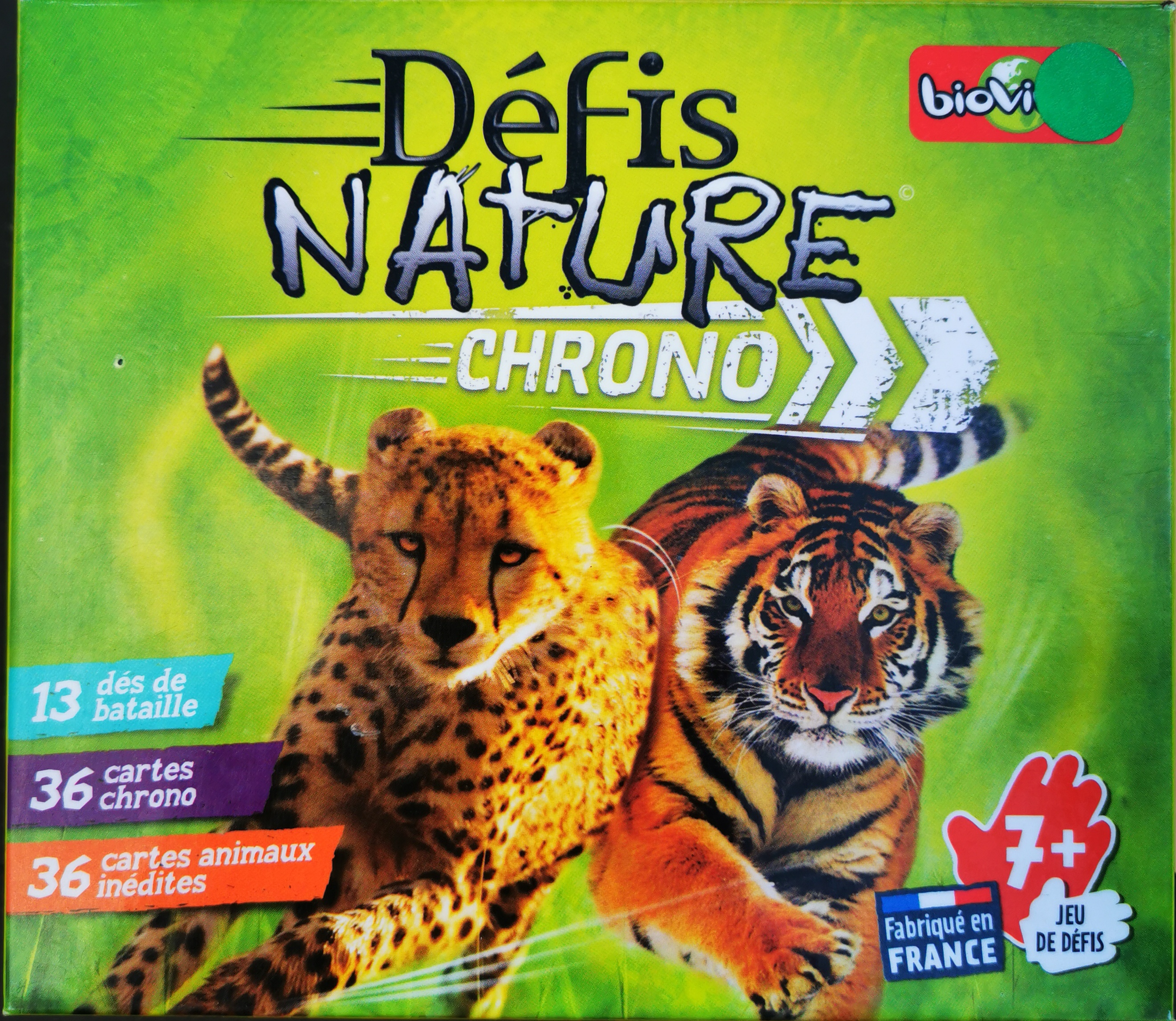 Description : Aiguise tes réflexes avec les cartes chrono pour obtenir le dé bonus. Choisis un animal suivant sa force, sa rapidité et sa capacité de camouflage. Joue avec tes dés de bataille pour mener ton animal à la victoire. En cas d'égalité, mise sur les caractéristiques de ton animal pour remporter la manche !