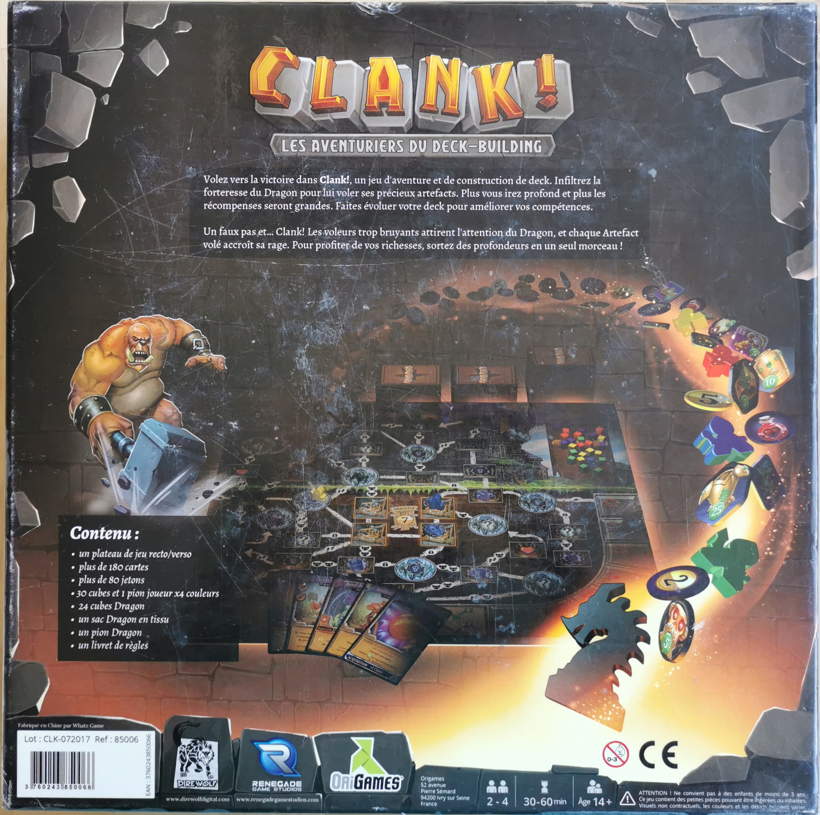 Matériel : 1 Plateau Recto-Verso, 43 Cartes Réserve (Mercenaires, Exploration, Goblin, ...), 4 decks de départ de 10 cartes, 100 Cartes Donjon, 7 Pions Artefacts, 29 Pions Secrets, 7 Pions Equipements (Clefs, Sac à dos, Couronnes), 3 Pions Idole Singes, 4 Pions Compétences, Pions Or, 120 Cubes Clank !, 1 Marqueur de Dragon, 1 Sac du Dragon, 24 Cubes Dragon, 4 Pions Joueurs