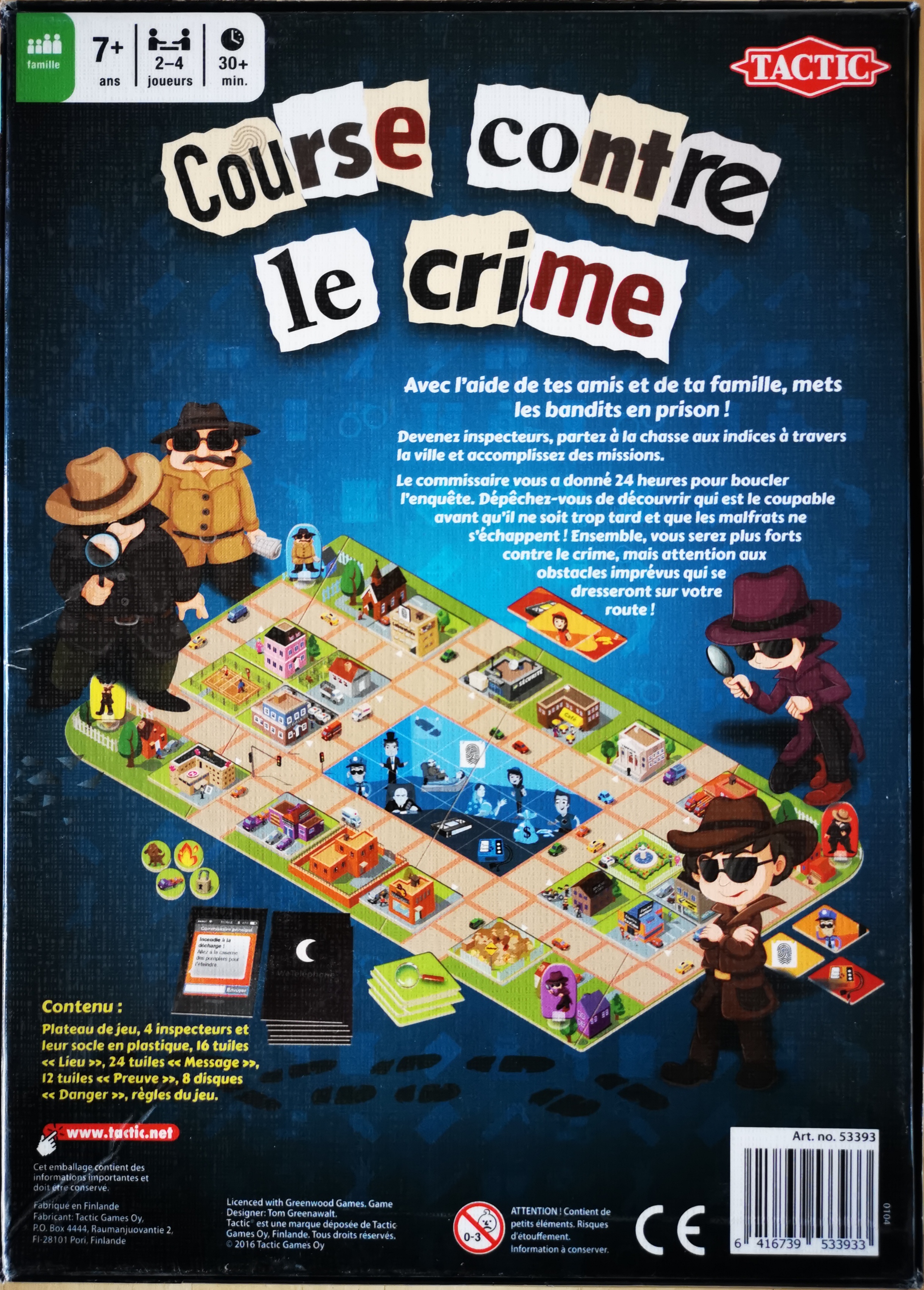 Matériel : 1 plateau de jeu, 4 détectives, 16 tuiles Lieu, 8 disques Danger, 24 tuiles WeTéléphone, 12 tuiles Preuve, règle