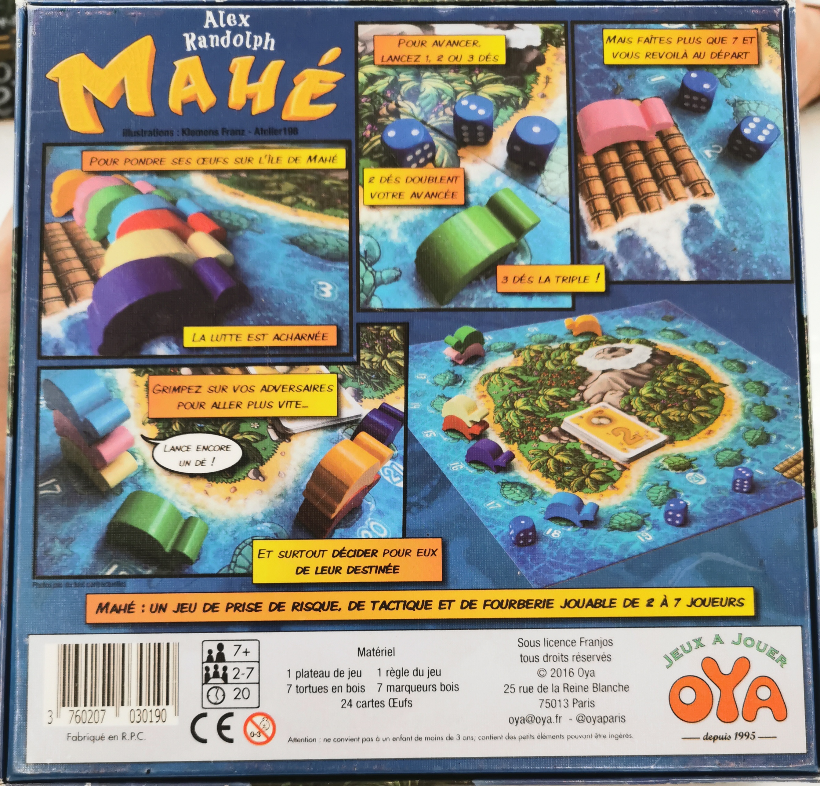 Matériel : 1 plateau de jeu, 7 figurines de tortues, 3 dés, 24 cartes, 1 règle du jeu
