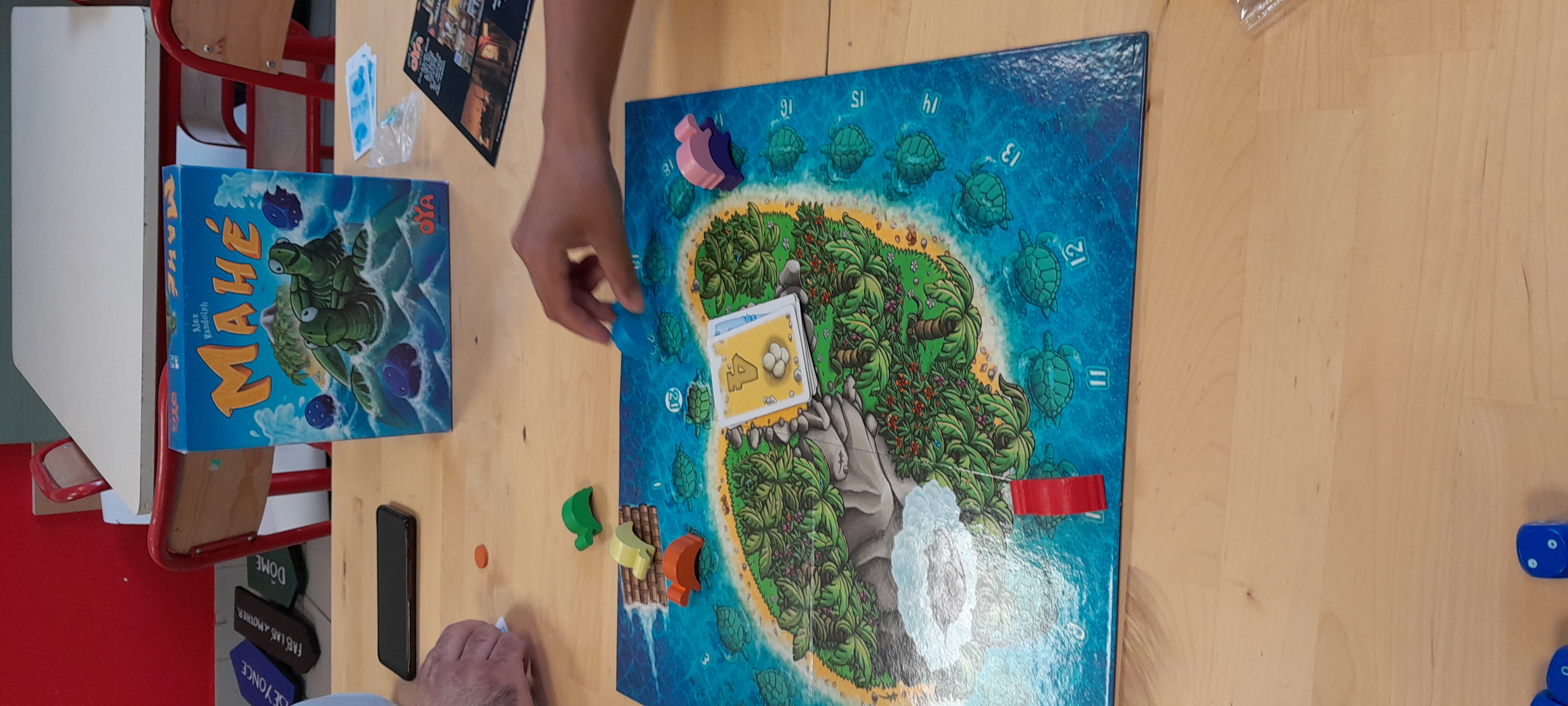 Description : Chaque joueur déplace une tortue dans un cercle autour de l'île. Chaque fois qu'une tortue atteint ou dépasse la plage, elle pose autant d'œufs que la carte indique. Lorsque la pioche est épuisée, sept autres œufs peuvent être stockés dans le dernier tour. Le joueur dont la tortue pourrait mettre le plus d'œufs gagne la partie.