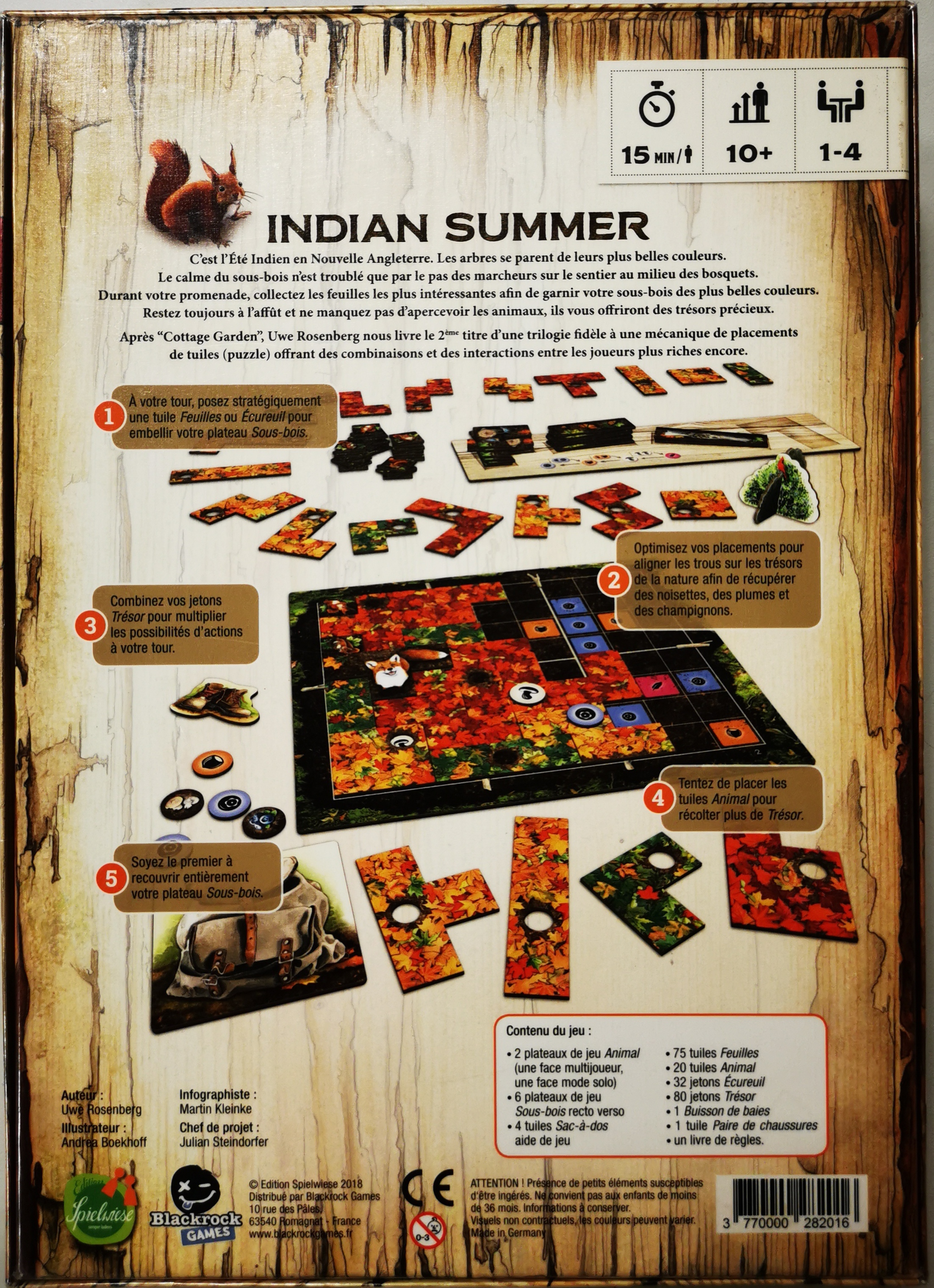 Matériel : 2 plateaux de jeu Animal, 6 plateaux de jeu Sousbois , 4 tuiles Sac-à-dos, 75 tuiles Feuilles , 20 tuiles Animal , 32 jetons Ecureuil , 80 jetons Trésor , 1 Buisson de baies , 1 tuile Paire de chaussures, 1 règle du jeu