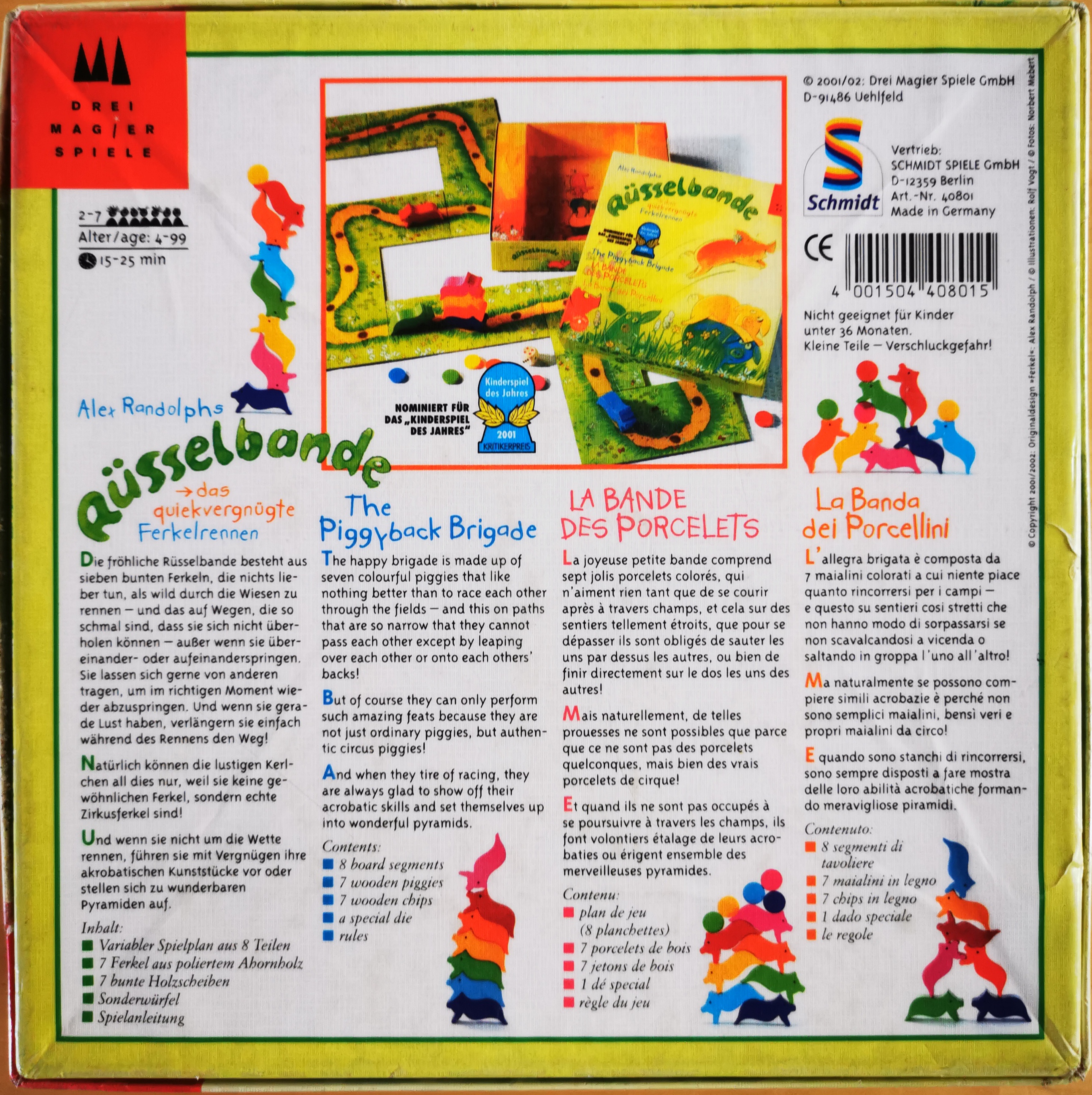 Matériel : Plateau de jeu (8 planchettes aux recto-verso variés), 7 porcelets en bois colorés, 7 jetons en bois correspondants, 1 dé spécial (6 faces : 1,1,2,3,3,4), 1 règle du jeu.