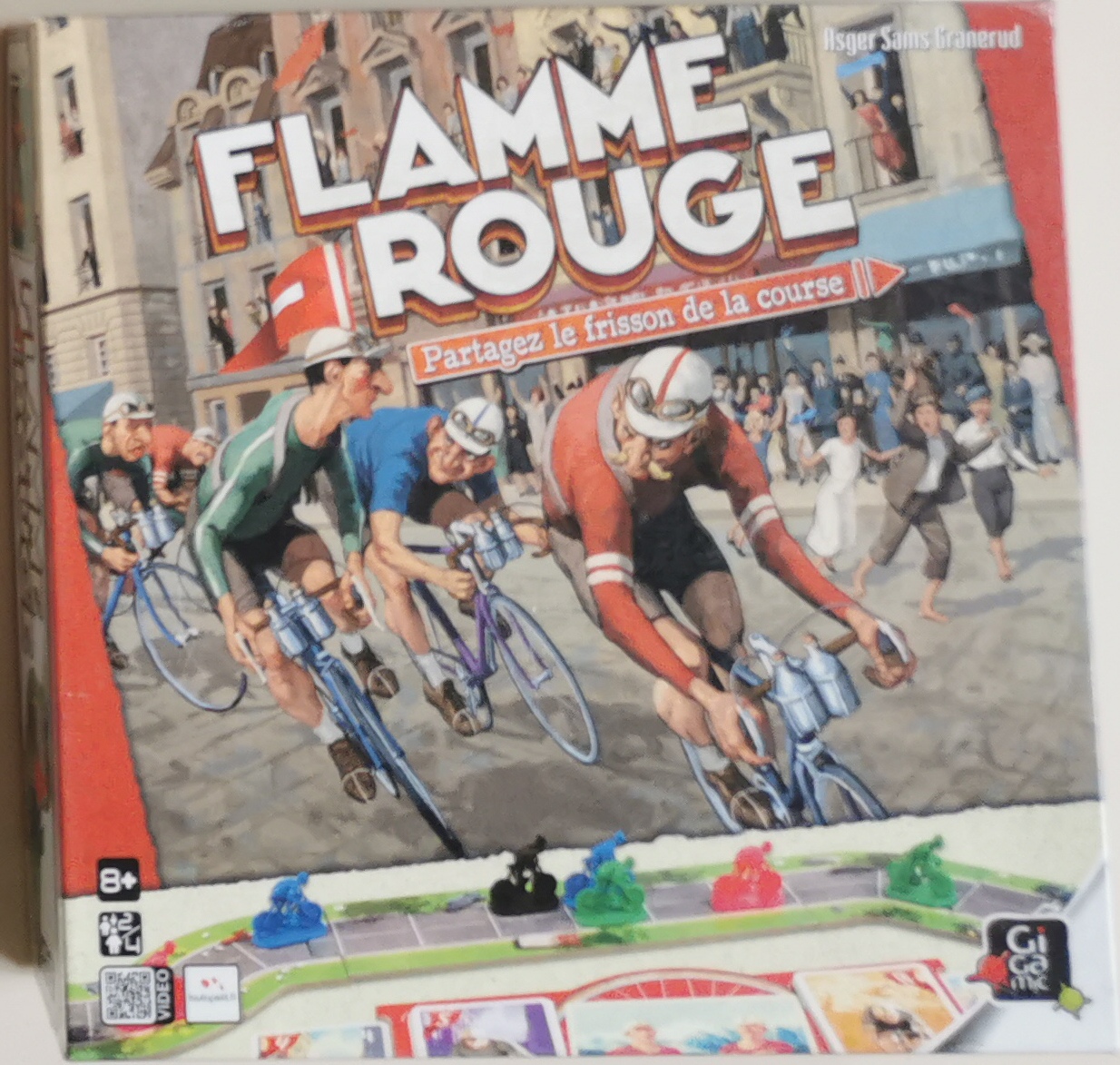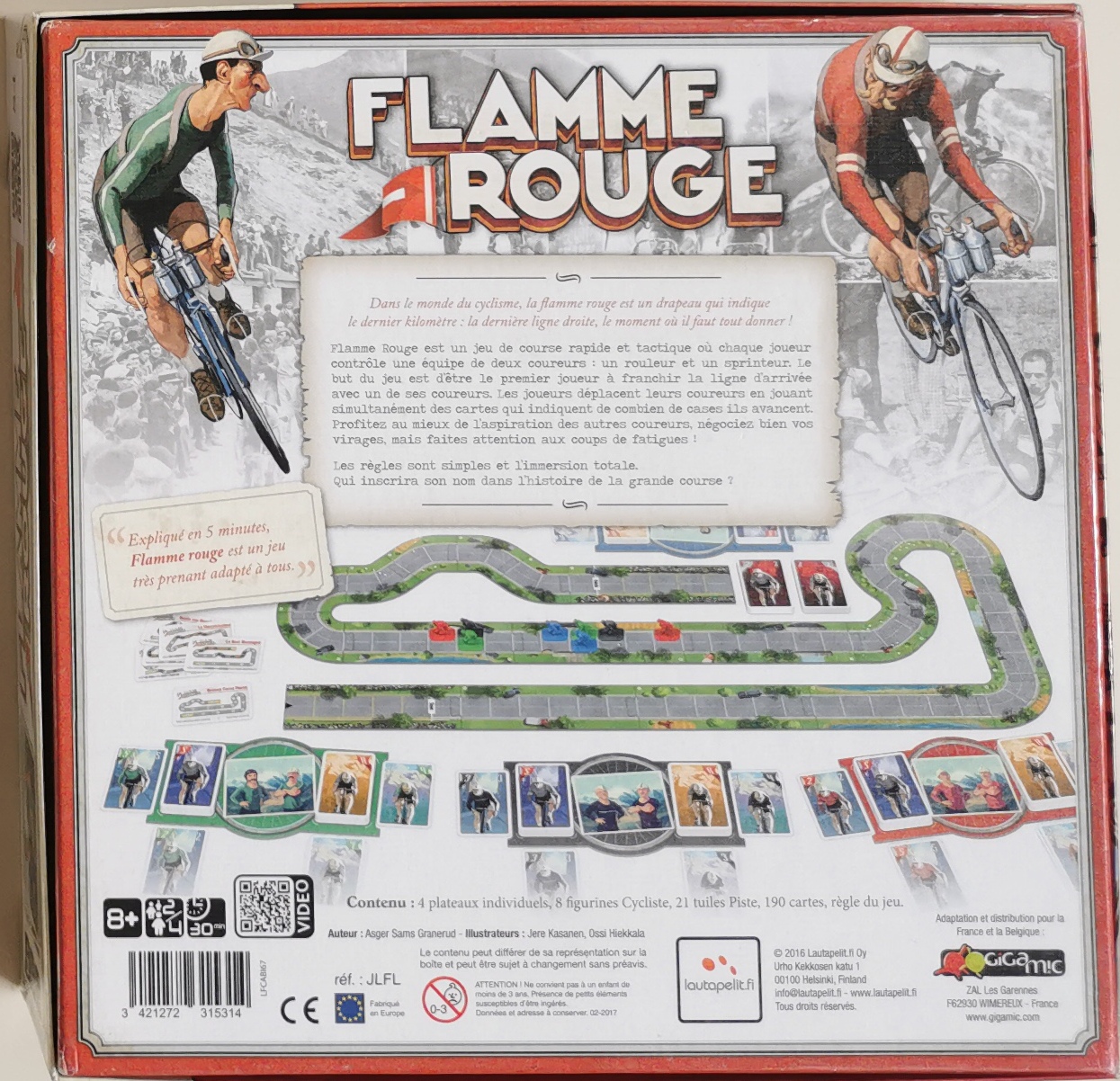 Description : Dans le monde du cyclisme, la flamme rouge est un drapeau qui indique le dernier kilomètre : la dernière ligne droite, le moment où il faut tout donner ! , , Flamme Rouge est un jeu de course rapide et tactique où chaque joueur contrôle une équipe de deux coureurs : un rouleur et un sprinteur. Le but du jeu est d'être le premier joueur à franchir la ligne d'arrivée avec un de ses coureurs. Les joueurs déplacent leurs coureurs en jouant simultanément des cartes qui indiquent le nombre de cases dont ils avancent. Profitez de l'aspiration des autres coureurs, négociez vos virages, mais attention aux coups de fatigues !