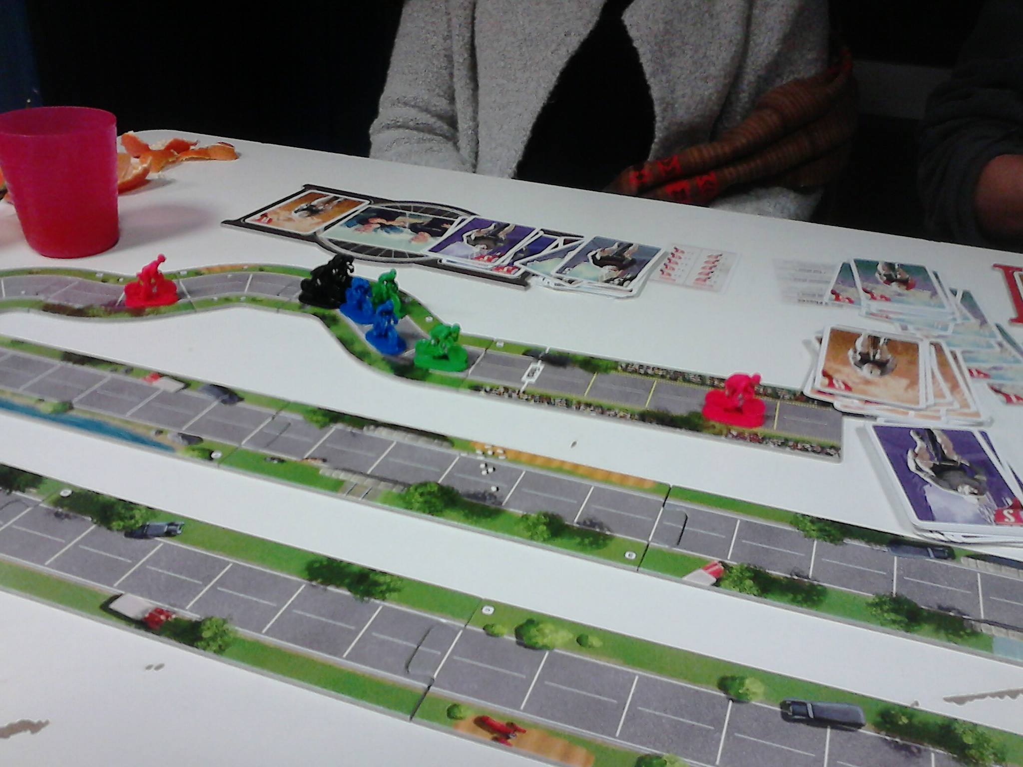Matériel : 4 plateaux de joueur, 8 figurines de cyclistes : 4 coureurs et 4 sprinter (1 pour chaque couleur), 21 tuiles de circuit double face, 120 cartes d'énergie, 60 cartes de fatigue, 6 cartes d'étape, 4 cartes de référence