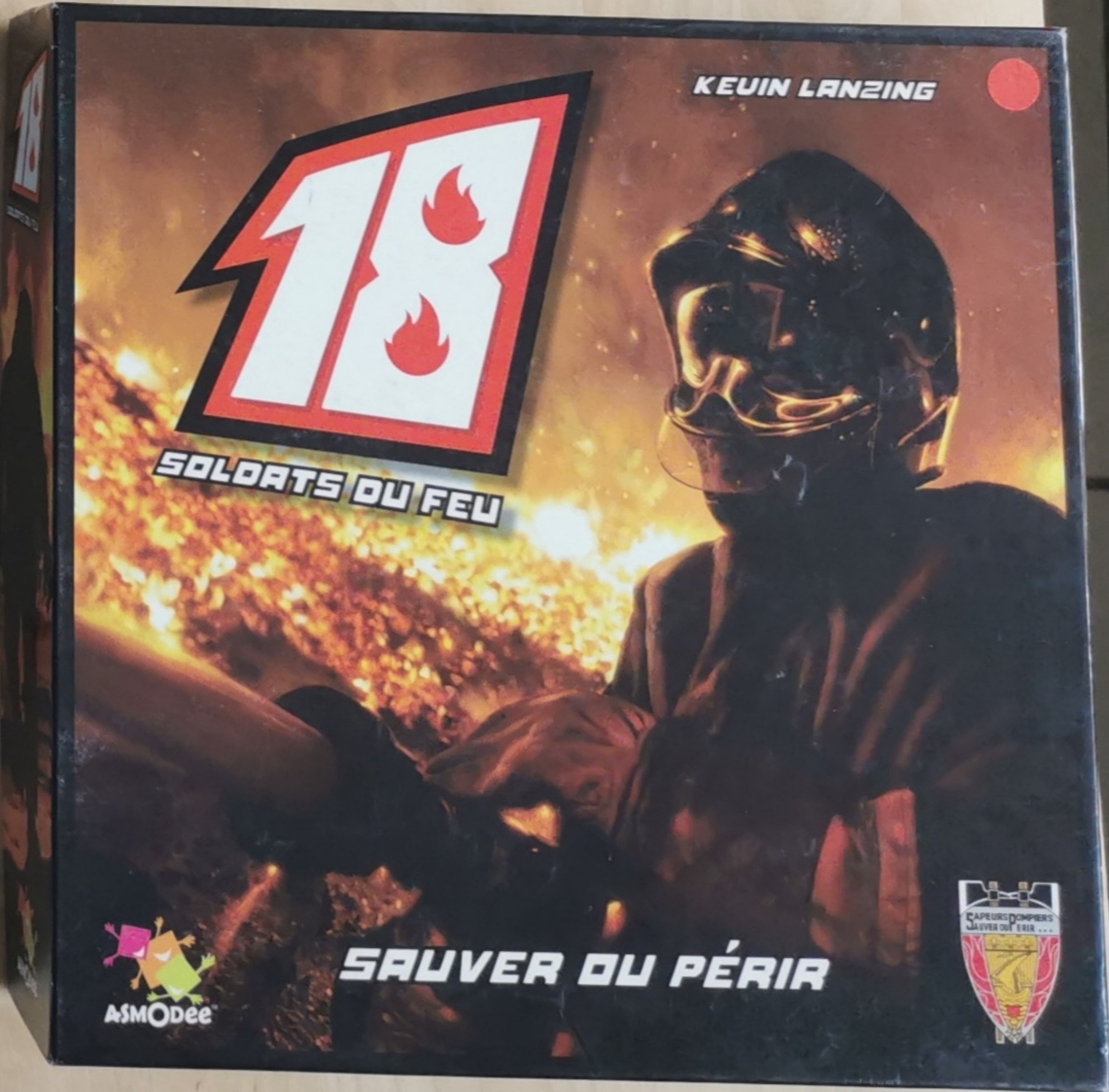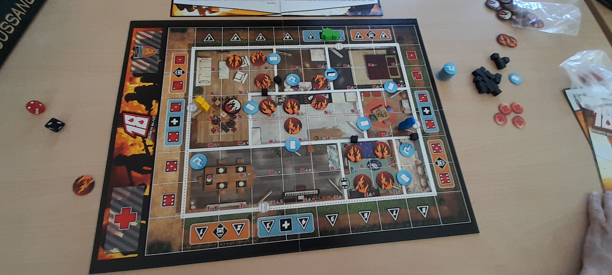 Matériel : 1 règle du jeu, 1 plateau, 6 pompiers, 36 Marqueurs menaces, 18 marqueurs HAS, 24 marqueurs dégâts, 8 marqueur porte, 24 marqueurs point chaud, 31 autre Marqueurs, 2 dés, 2 véhicules, 6 cartes insignes, 8 Spécialistes.