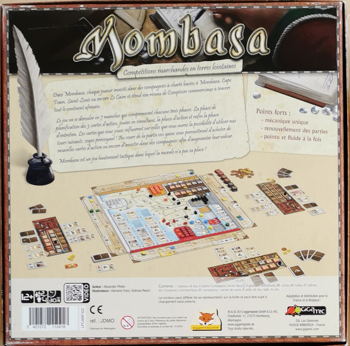 Description : Mombasa nous plonge dans le thème du colonialisme Africain, thème qui peut en rebuter certains mais qui, moi, me parle bien. Même si certaines mécaniques sont assez abstraites, le plateau Africain ainsi que les différentes ressources (bananes, café et diamants) nous permettent de vivre le thème un minimum.