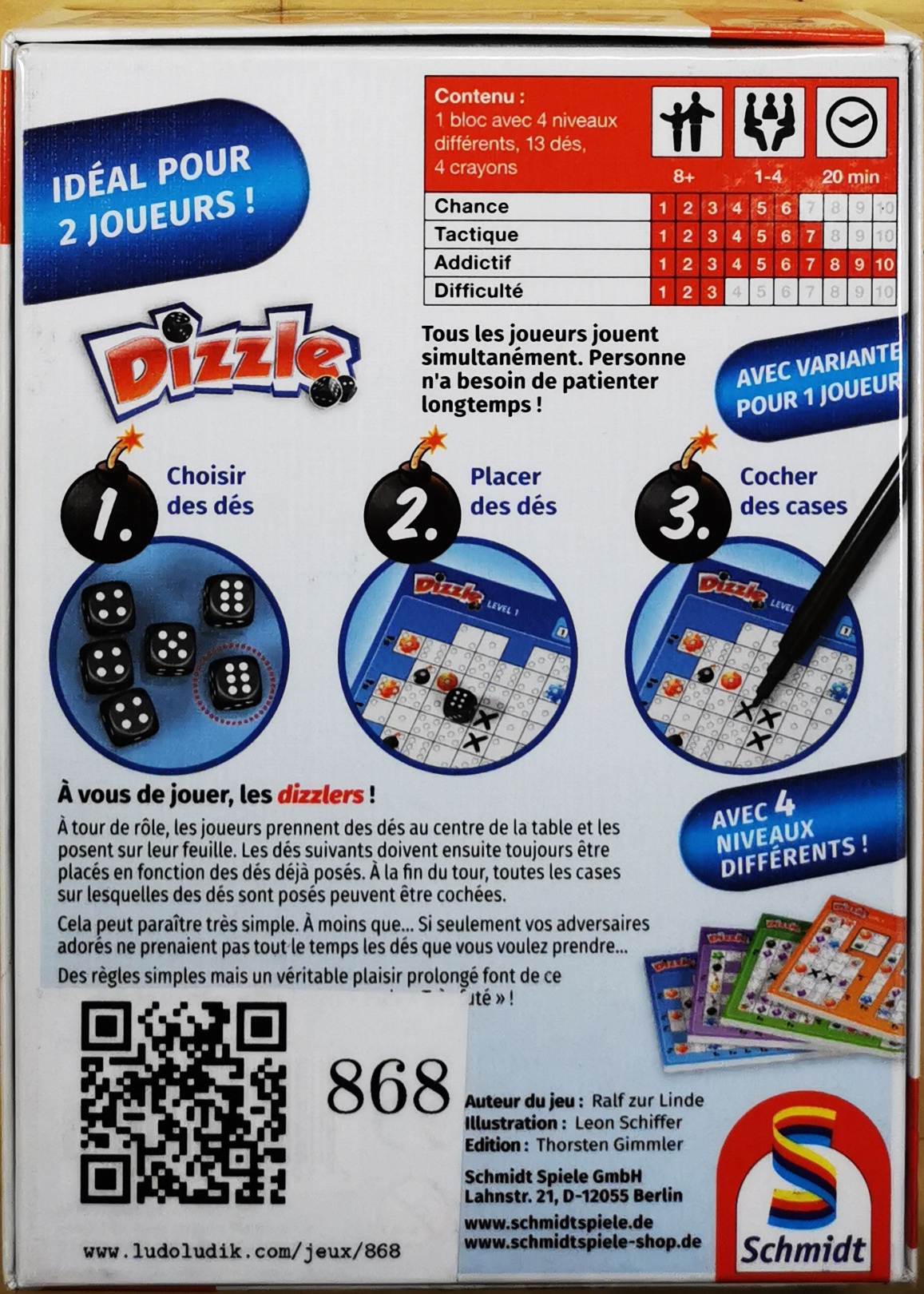 Description : Dans Dizzle, vous allez une fois de plus vous retrouver avec un roll’n’write, ces fameux jeux où vous lancez des dés et que vous les reportez sur une feuille de score. Les parties vont varier en fonction du nombre de joueurs. Un peu comme dans Très Futé, Vraiment très Futé et Encore ! vous allez devoir marquer le plus de points bien entendu.